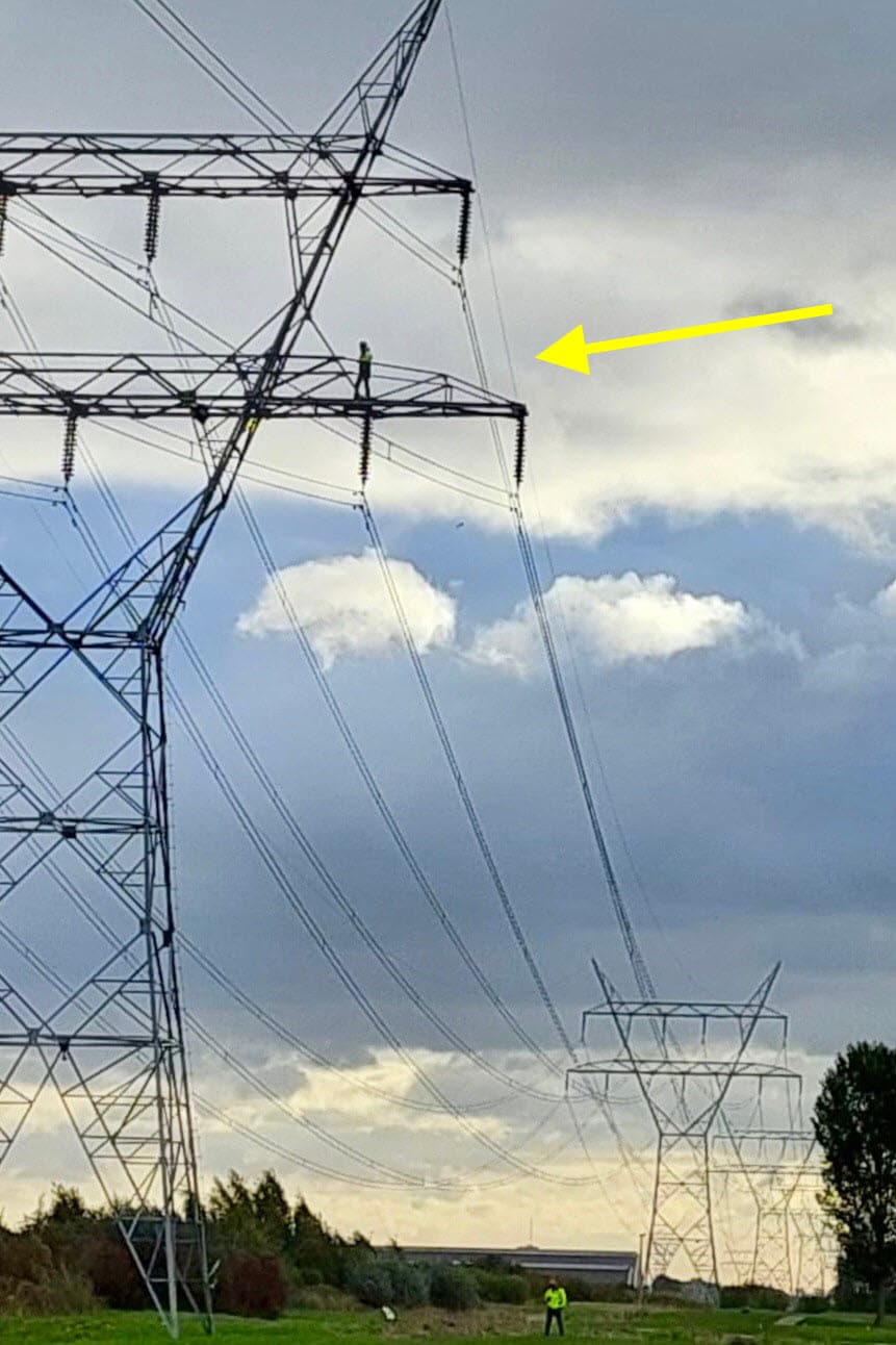 Medewerkers van Liander halen acrobatische toeren uit op een hoogte van tientallen meters als zij maandagmorgen boven de fairway van holes 5 en 6 op inspectietocht gaan. Sinds de grote stroomstoring van enkele maanden geleden, die ook een enorme impact had op de golfers die op dat moment op hole 5, 6 of 7 liepen, kunnen de technici van de netbeheerder zich verzekerd weten van meer aandacht dan voorheen voor het fascinerende werk dat zij moeten doen om een permanente stroomtoevoer te kunnen garanderen. (foto’s Rob van Dijk)