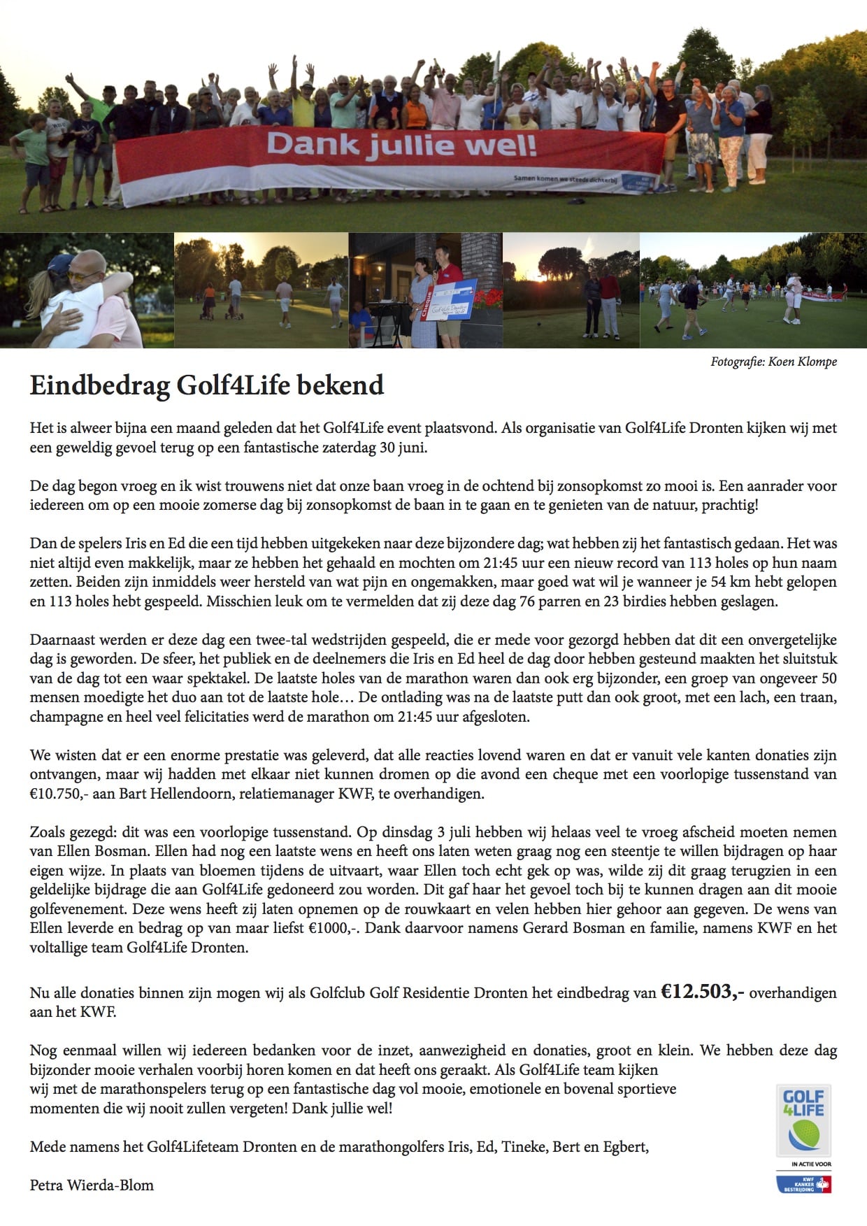De actie Golf4Life heeft € 12.503 opgebracht. Dat is ruim € 1700 meer dan op de slotavond, een maand geleden, bekend werd gemaakt. “We wisten dat er een enorme prestatie was geleverd, maar we hadden op die avond niet kunnen dromen dat we toen een cheque van € 10.750,00 aan het Koningin Wilhelmina Fonds konden overhandigen”, schrijft Petra Wierda in een bericht aan alle betrokkenen. Daarin legt ze uit waardoor het ingezamelde bedrag nog tot € 12,503 kon oplopen.