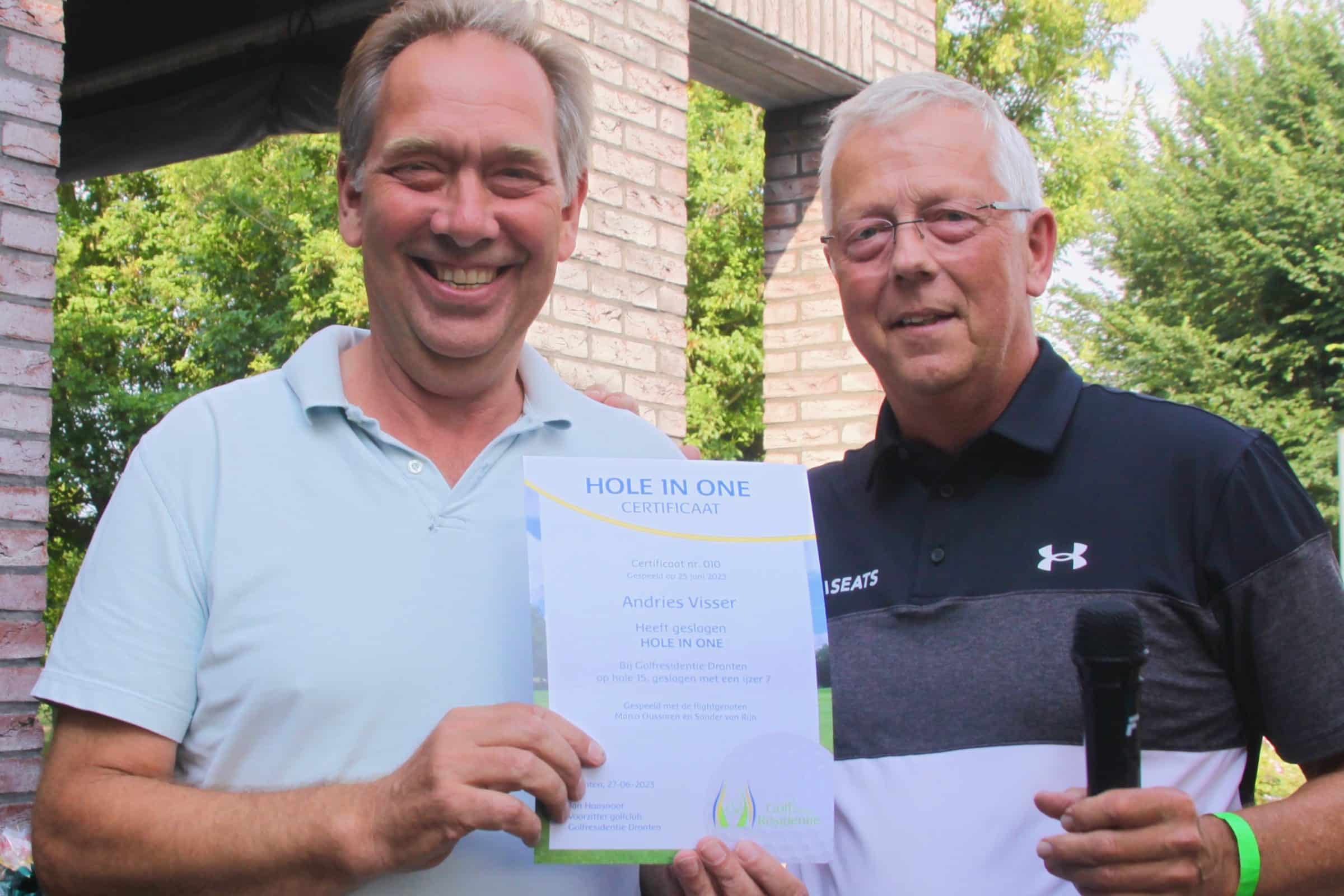 Andries Visser heeft uit handen van golfclubbestuurder Herman van Someren een certificaat ontvangen voor de hole in one die hij afgelopen zondag tijdens het clubkampioenschap Strokeplay sloeg. Dat gebeurde op een overvol terras van De Vier Seizoenen na afloop van de succesvolle derde Mixed Friday-wedstrijd van dit jaar die werd gewonnen door het team van Hans van den Heuvel. Om aan te geven hoe bijzonder het slaan van een hole in one is, memoreerde Herman dat in de 26 jaar dat de golfclub bestaat slechts 22 keer eerder een ace werd geslagen, waarvan zes keer op hole 15. Op hole 15 sloeg Andries met een ijzer 7 van de witte tee zijn bal 140 meter verder in de hole. “Een aparte ervaring”, zei hij daar later over. (HdJ)