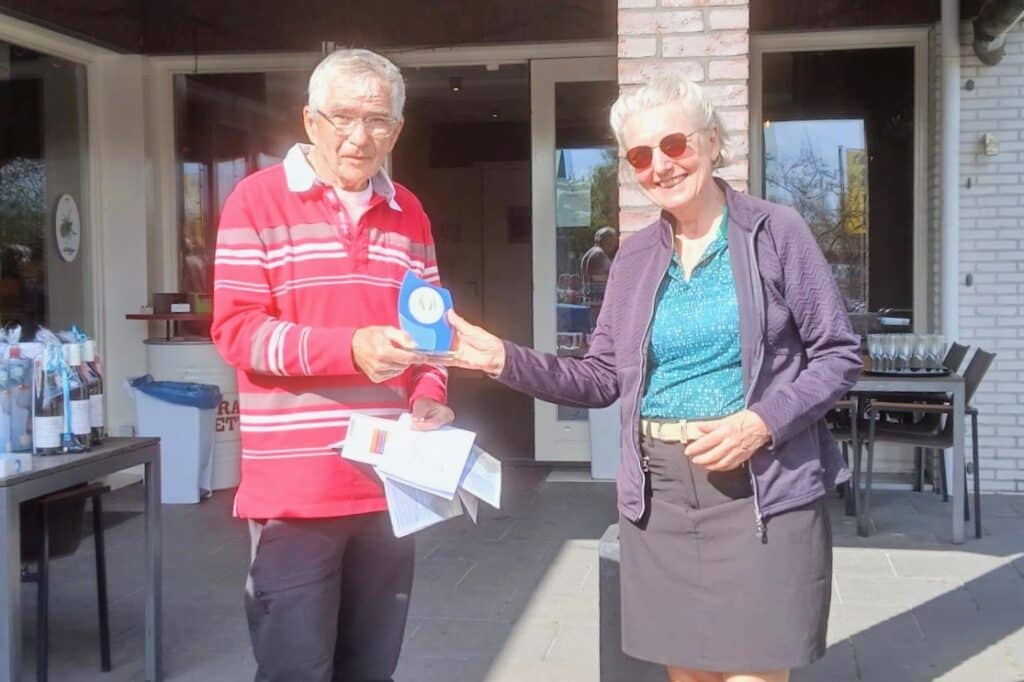In het clubhuis werd bij de prijsuitreiking aan de ultieme traditie vorm en inhoud gegeven en werd iedereen verrast met een glas koele bubbels. “Ja”, aldus Anne-Mieke, “dit overkomt me eens maar zeker geen tweede keer”. Nadat ze de hole in one had geslagen, was het ook gelijk gedaan met haar spel. “Op 8, 9 en 10 sloeg ik vervolgens totaal 1 Stablefordpunt bij elkaar”.
