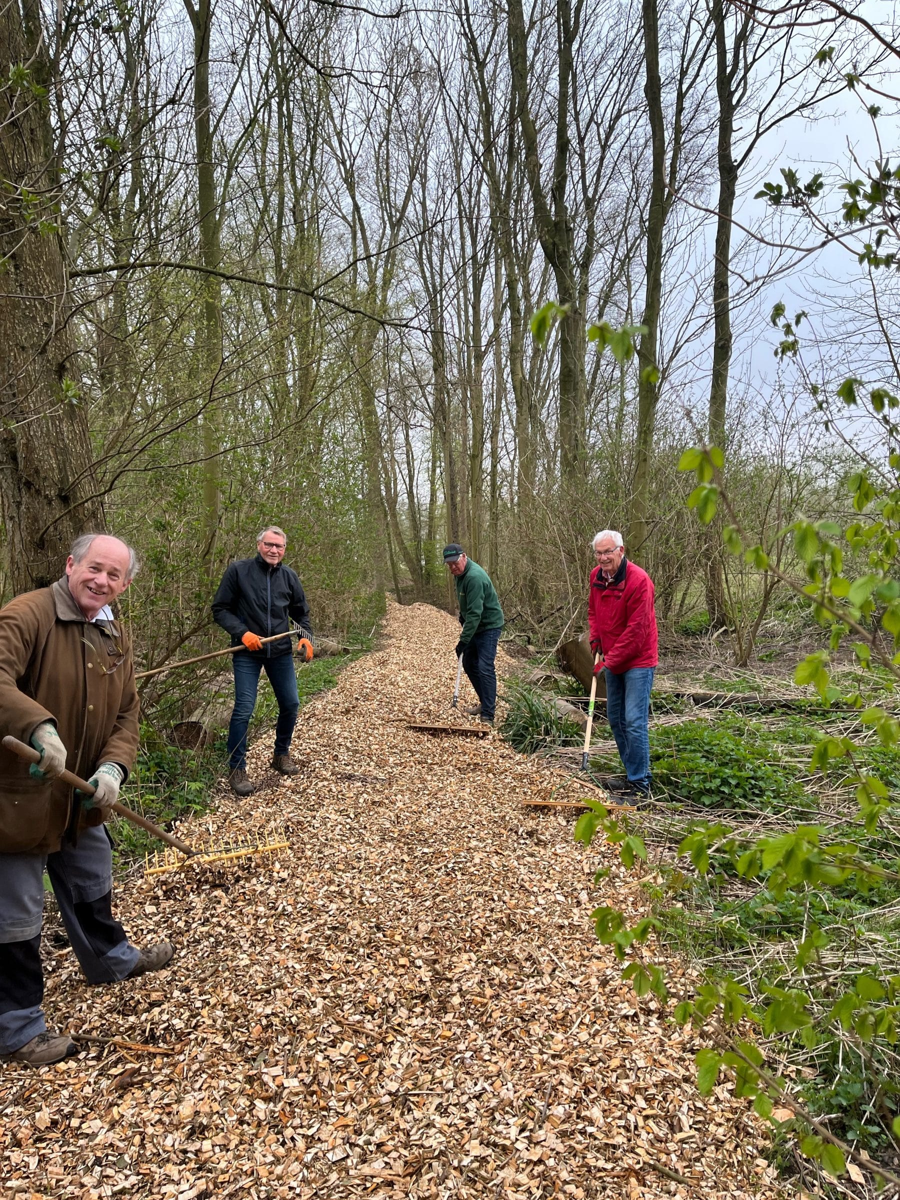 Nadat Egbert Geerlig vorige week voldoende houtsnippers had aangevoerd, zijn vandaag de vrijwilligers van de werkgroep Natuur&Milieu hard aan het werk een goede verdeling over het Bospad te maken. Een frisse bodembedekker voor een prachtige wandeltocht dit fraaie voorjaar.