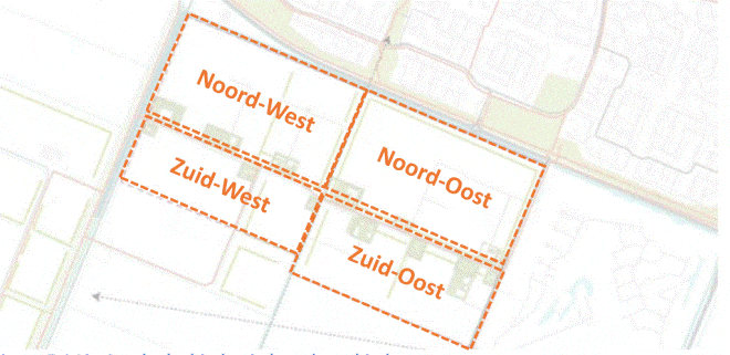 - Hoe het gebied in delen (kwadranten) wordt ontwikkeld. We stellen voor om te starten in het noordoosten. Zie de kaart hieronder.