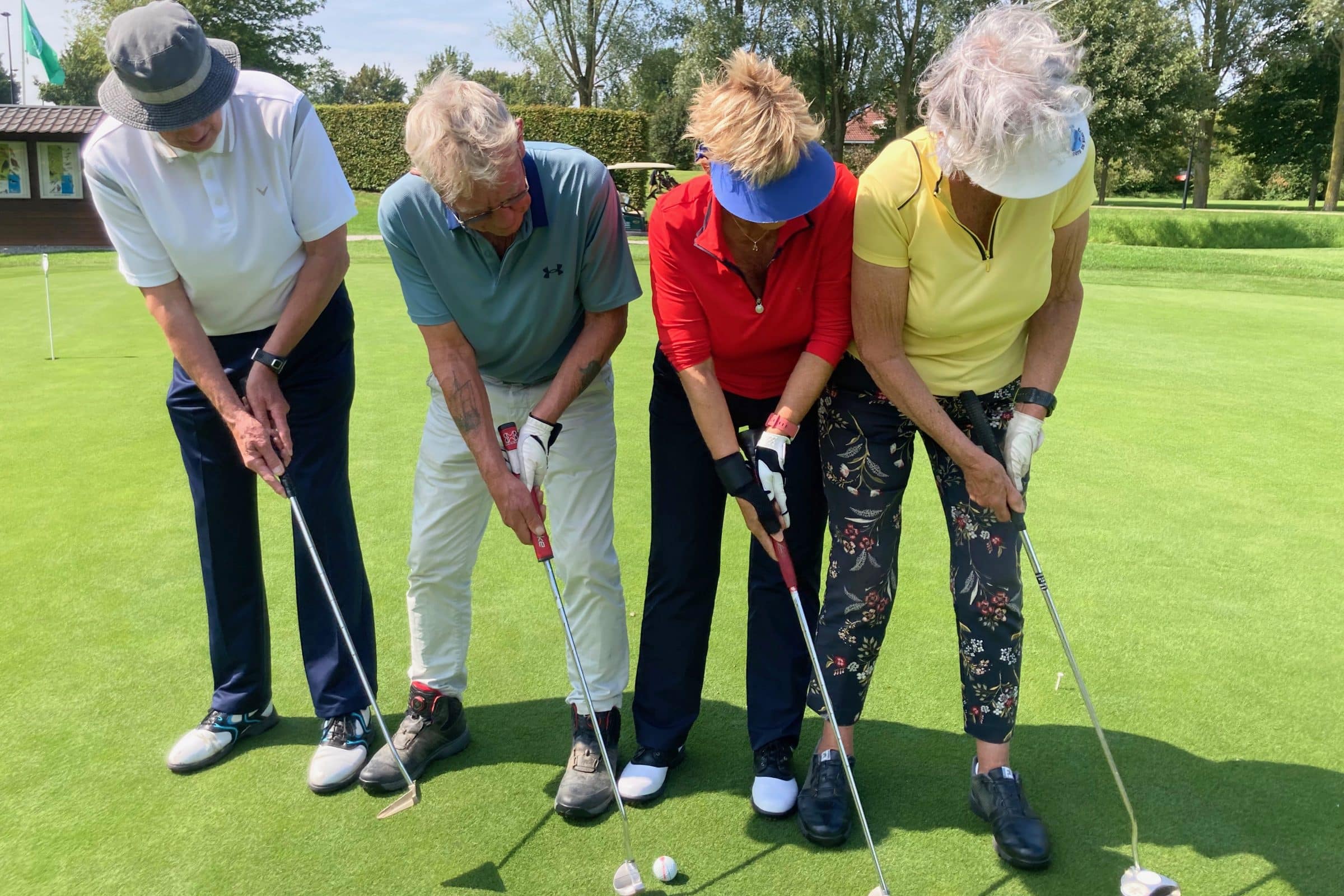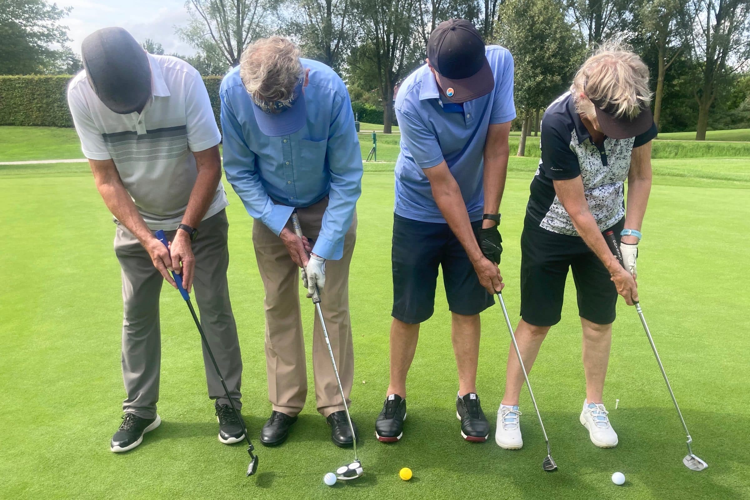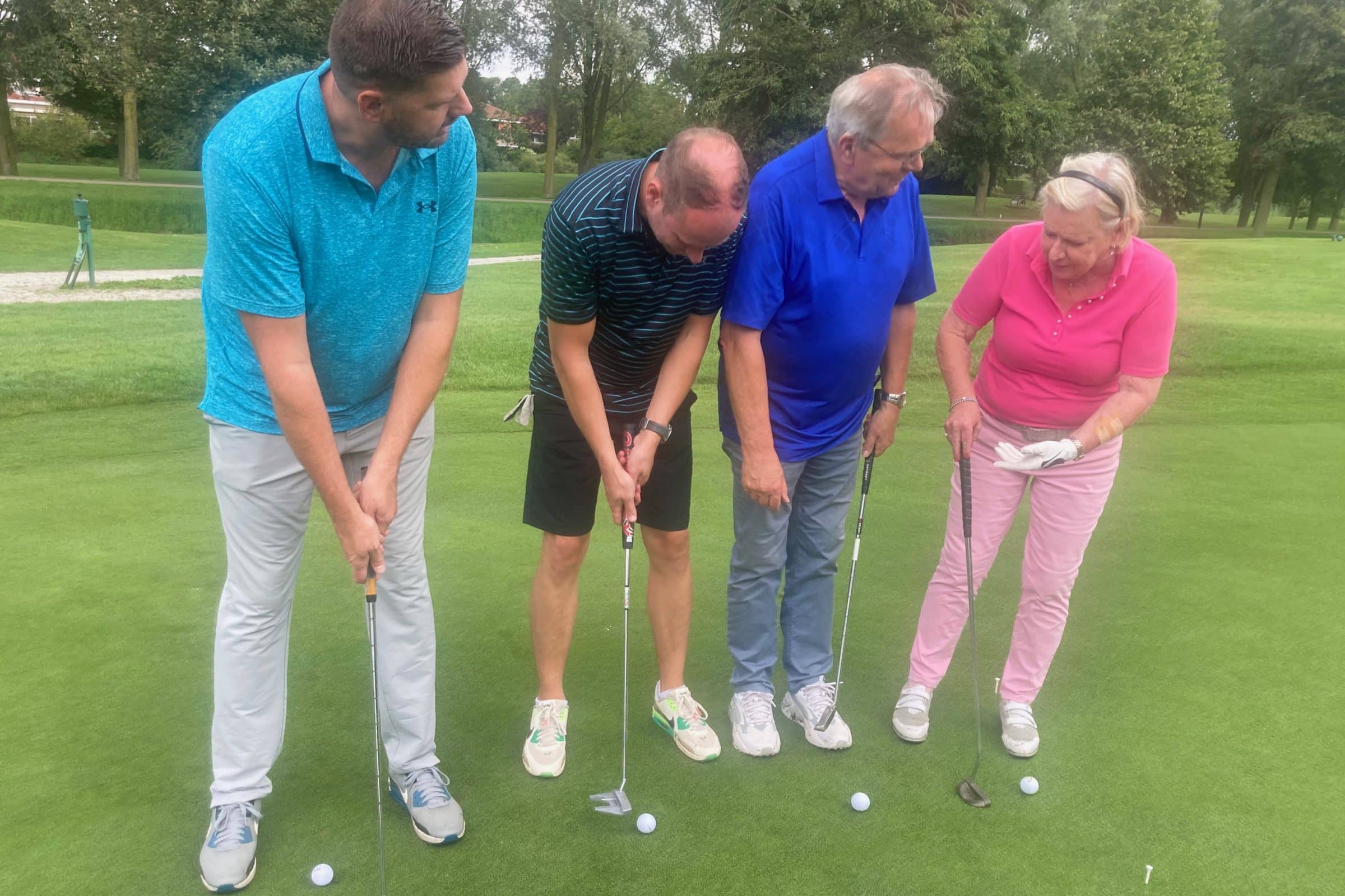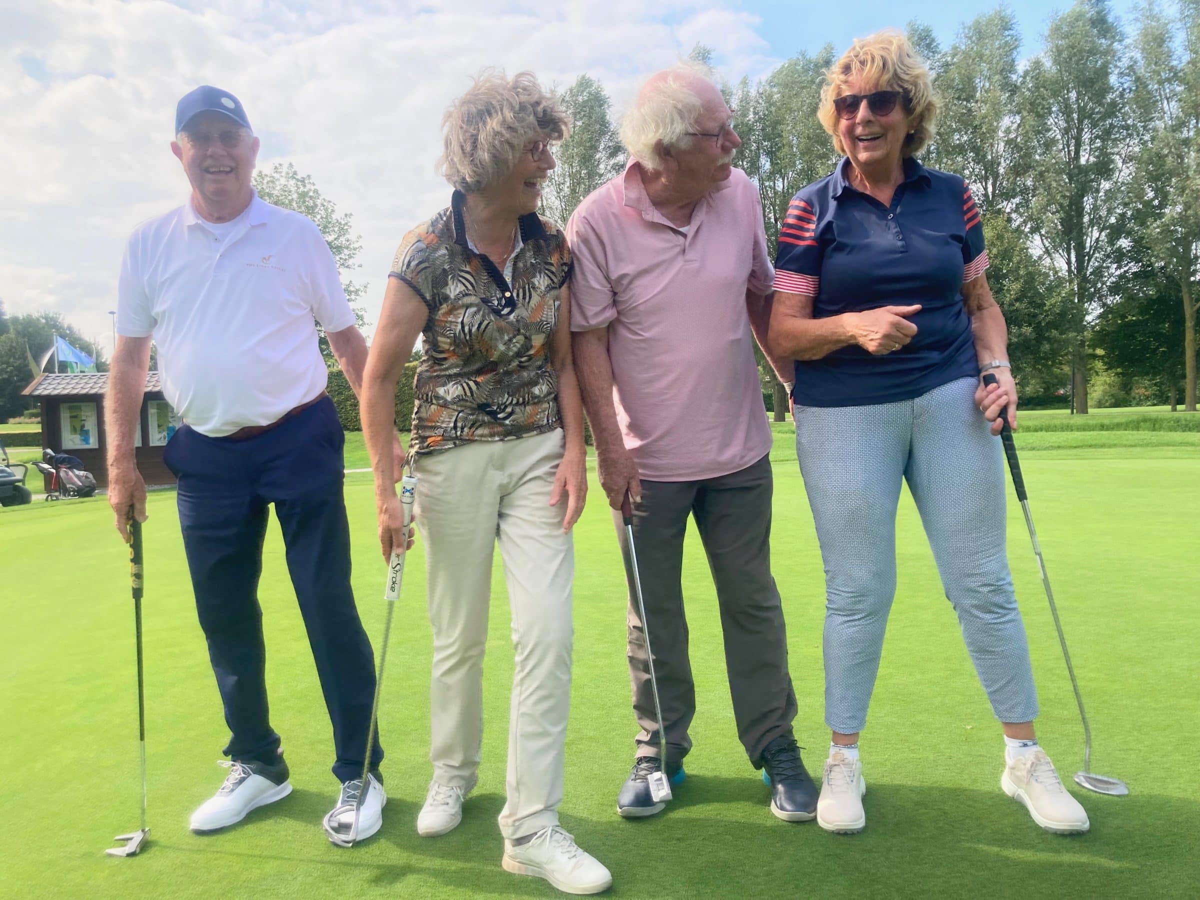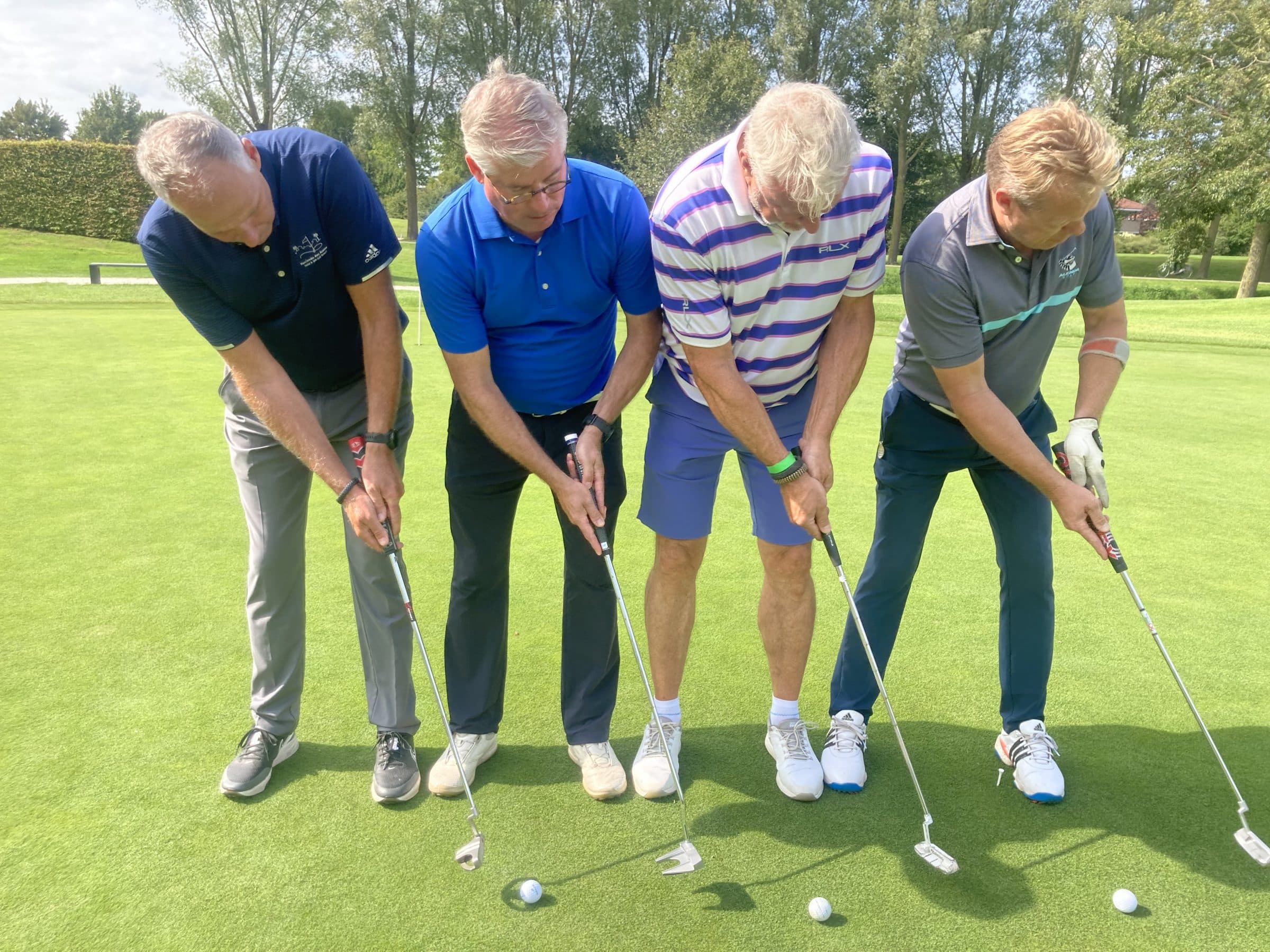 Een challenge op de puttinggreen bij hole 1 speelde de absolute hoofdrol in de vierde aflevering van dit jaar van de Firmseats Mixed Friday serie. Schouder-aan-schouder moesten de twintig afzonderlijke flights proberen om vier balletjes als een trein in het putje te laten verdwijnen. Slechts weinigen slaagden erin om het goeie spelritme te pakken hetgeen voor veel hilariteit zorgde. Twee teams, te weten de flights van Roel Tets en van Ad Veringa, wisten uit de drie pogingen er één keer in te slagen om de balletjes in een vloeiende beweging naar de put te dirigeren. De uitdaging was ook nu weer bedacht door het commissielid Herman van Someren die bekend staat als Mr Challenge maar er zelf niet in slaagde om punten te scoren. De Firmseats Mixed Friday Strokeplay wedstrijd werd voor de helft over de baan van de Golfresidentie gespeeld en voor de andere negen holes over die van de Openbare Golfclub Dronten. Het team van Pieter Riedstra had netto de minste slagen nodig en won de wedstrijd (middelste grote foto). Het team van Robert Verbruggen werd, met één slag meer, tweede. De prijzen werden op een zonovergoten en overvol terras uitgereikt door commissie-voorzitter Jan de Vries die ook loffelijke woorden had richting de keukenbrigade van De Vier Seizoenen. Die serveerde een Indisch buffet waar iedereen buitengewoon complimenteus over was. (HdJ)