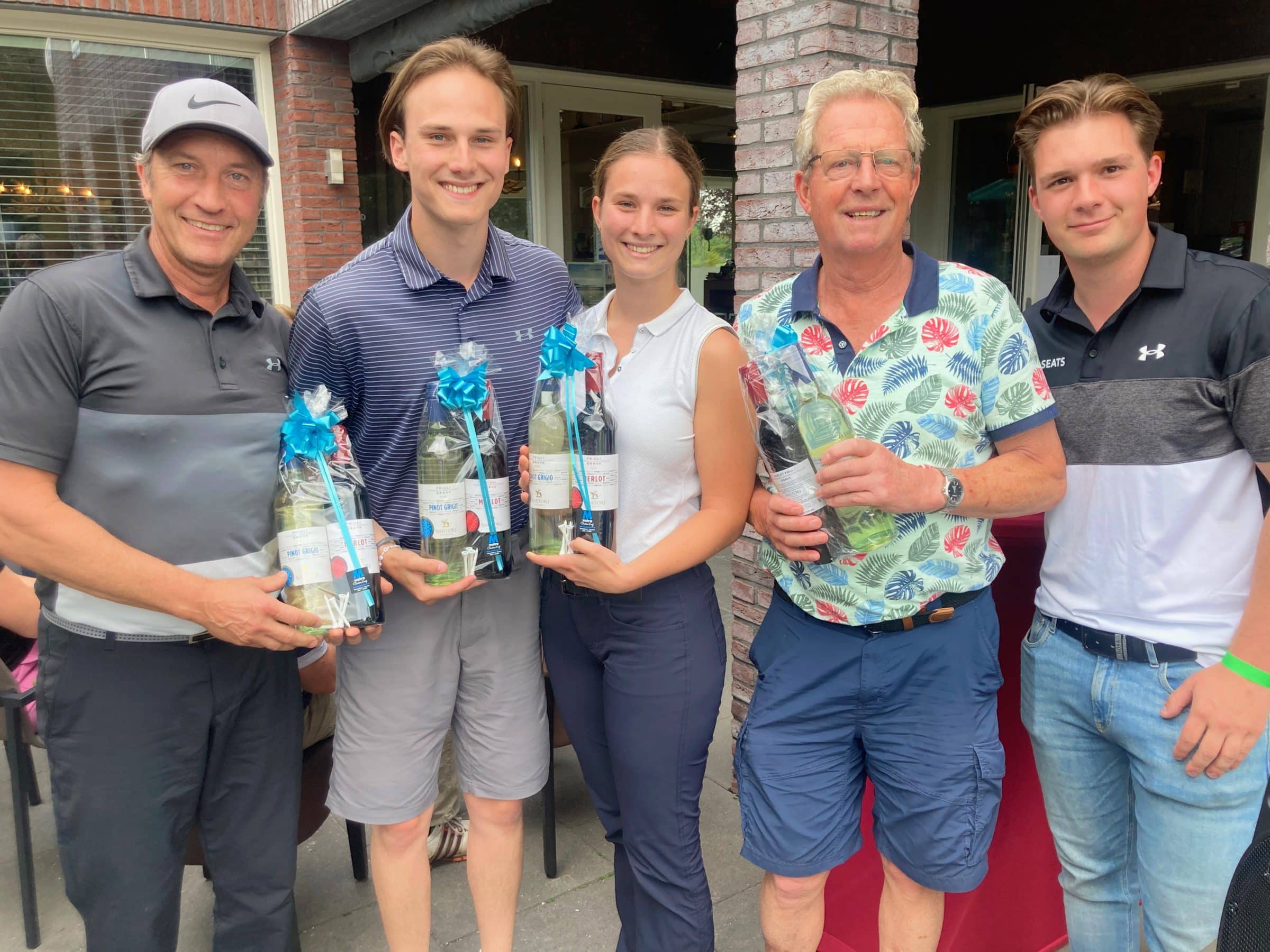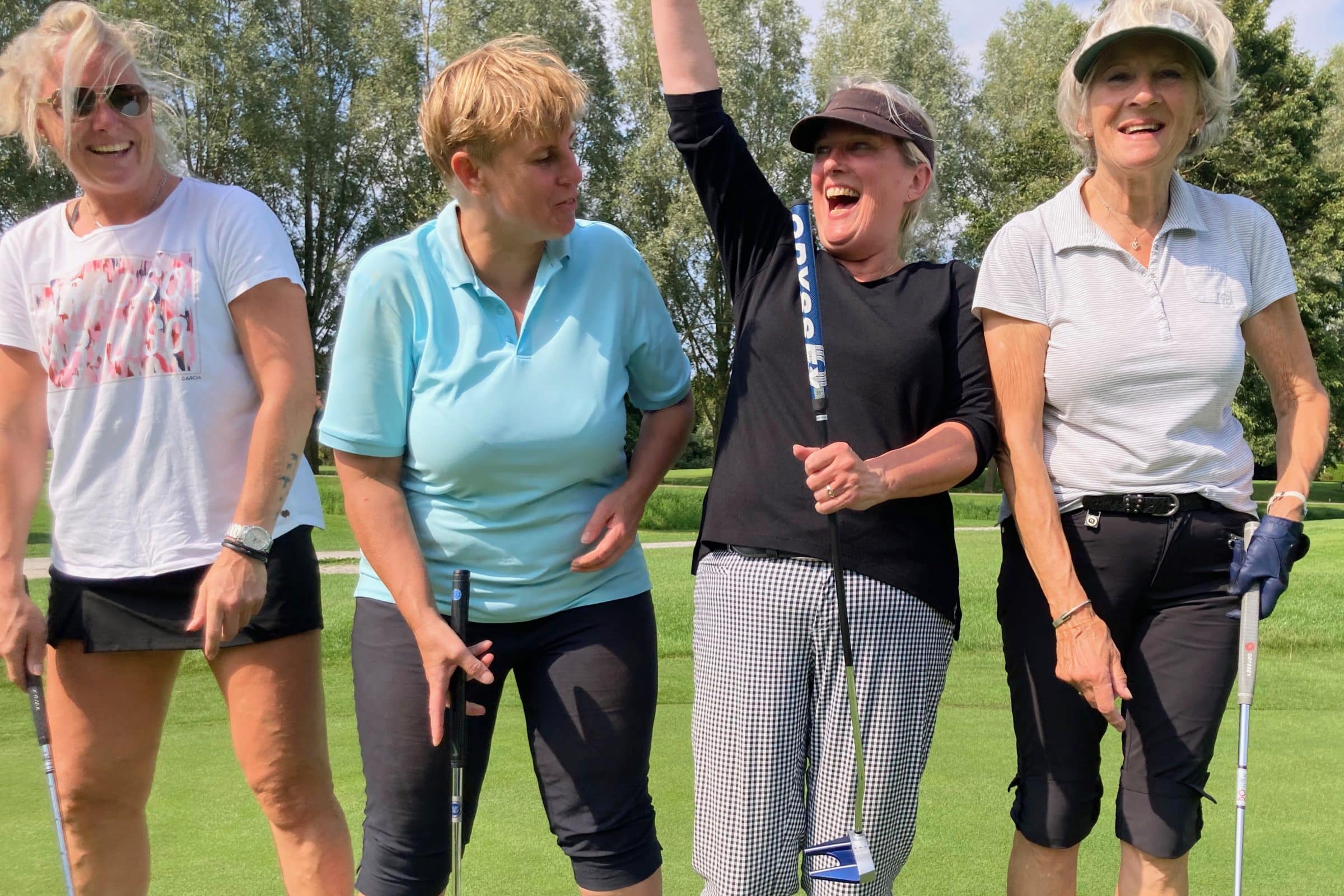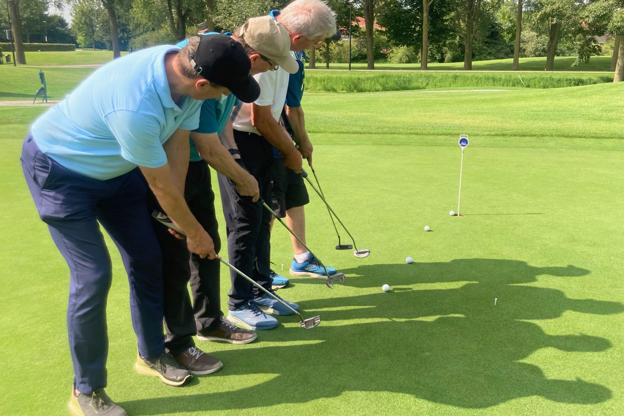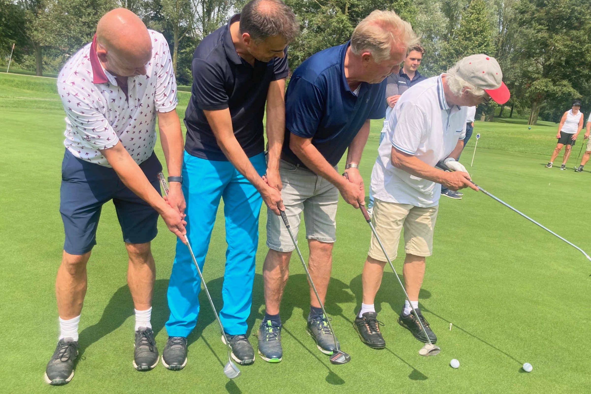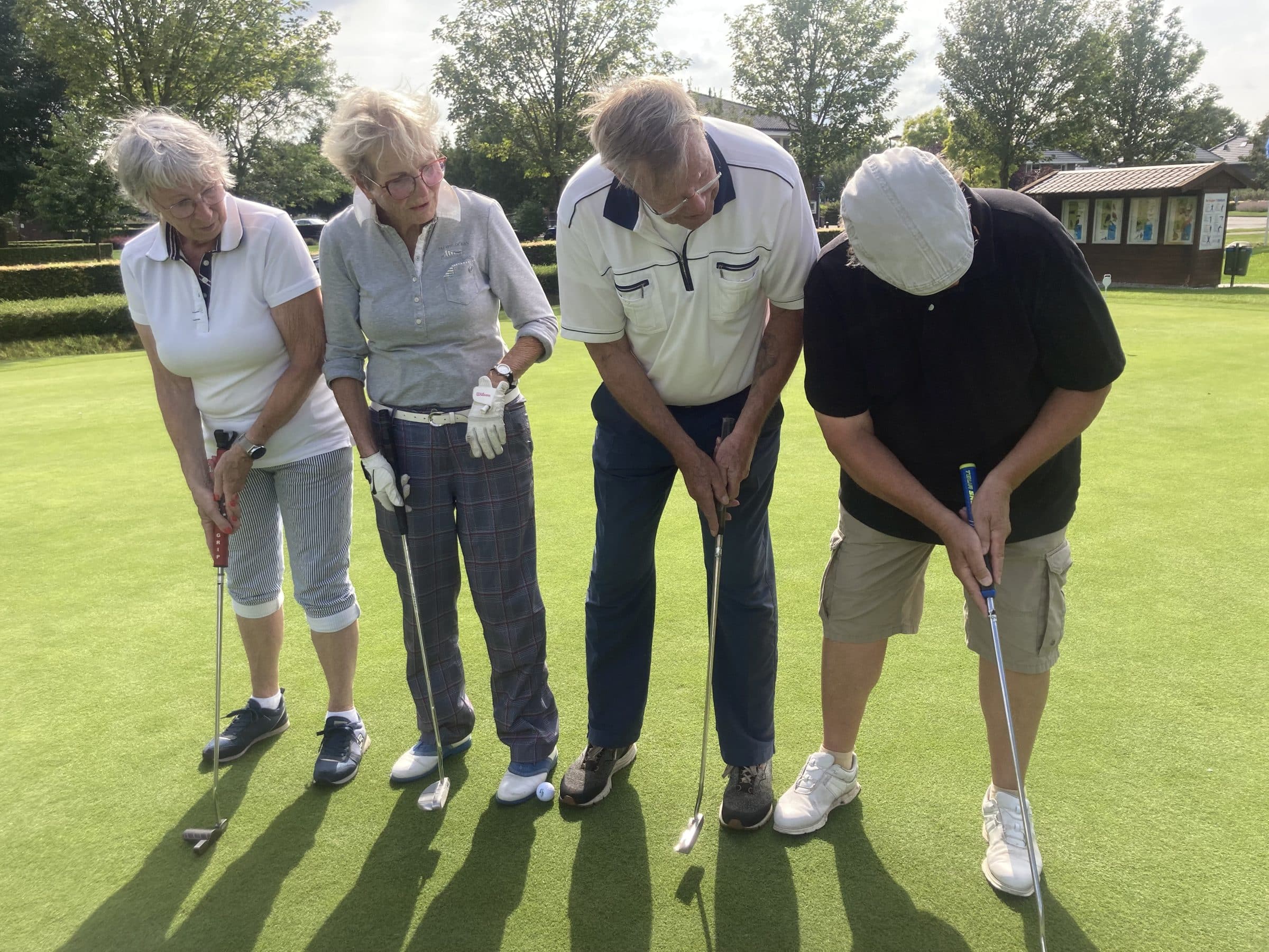 Een challenge op de puttinggreen bij hole 1 speelde de absolute hoofdrol in de vierde aflevering van dit jaar van de Firmseats Mixed Friday serie. Schouder-aan-schouder moesten de twintig afzonderlijke flights proberen om vier balletjes als een trein in het putje te laten verdwijnen. Slechts weinigen slaagden erin om het goeie spelritme te pakken hetgeen voor veel hilariteit zorgde. Twee teams, te weten de flights van Roel Tets en van Ad Veringa, wisten uit de drie pogingen er één keer in te slagen om de balletjes in een vloeiende beweging naar de put te dirigeren. De uitdaging was ook nu weer bedacht door het commissielid Herman van Someren die bekend staat als Mr Challenge maar er zelf niet in slaagde om punten te scoren. De Firmseats Mixed Friday Strokeplay wedstrijd werd voor de helft over de baan van de Golfresidentie gespeeld en voor de andere negen holes over die van de Openbare Golfclub Dronten. Het team van Pieter Riedstra had netto de minste slagen nodig en won de wedstrijd (middelste grote foto). Het team van Robert Verbruggen werd, met één slag meer, tweede. De prijzen werden op een zonovergoten en overvol terras uitgereikt door commissie-voorzitter Jan de Vries die ook loffelijke woorden had richting de keukenbrigade van De Vier Seizoenen. Die serveerde een Indisch buffet waar iedereen buitengewoon complimenteus over was. (HdJ)