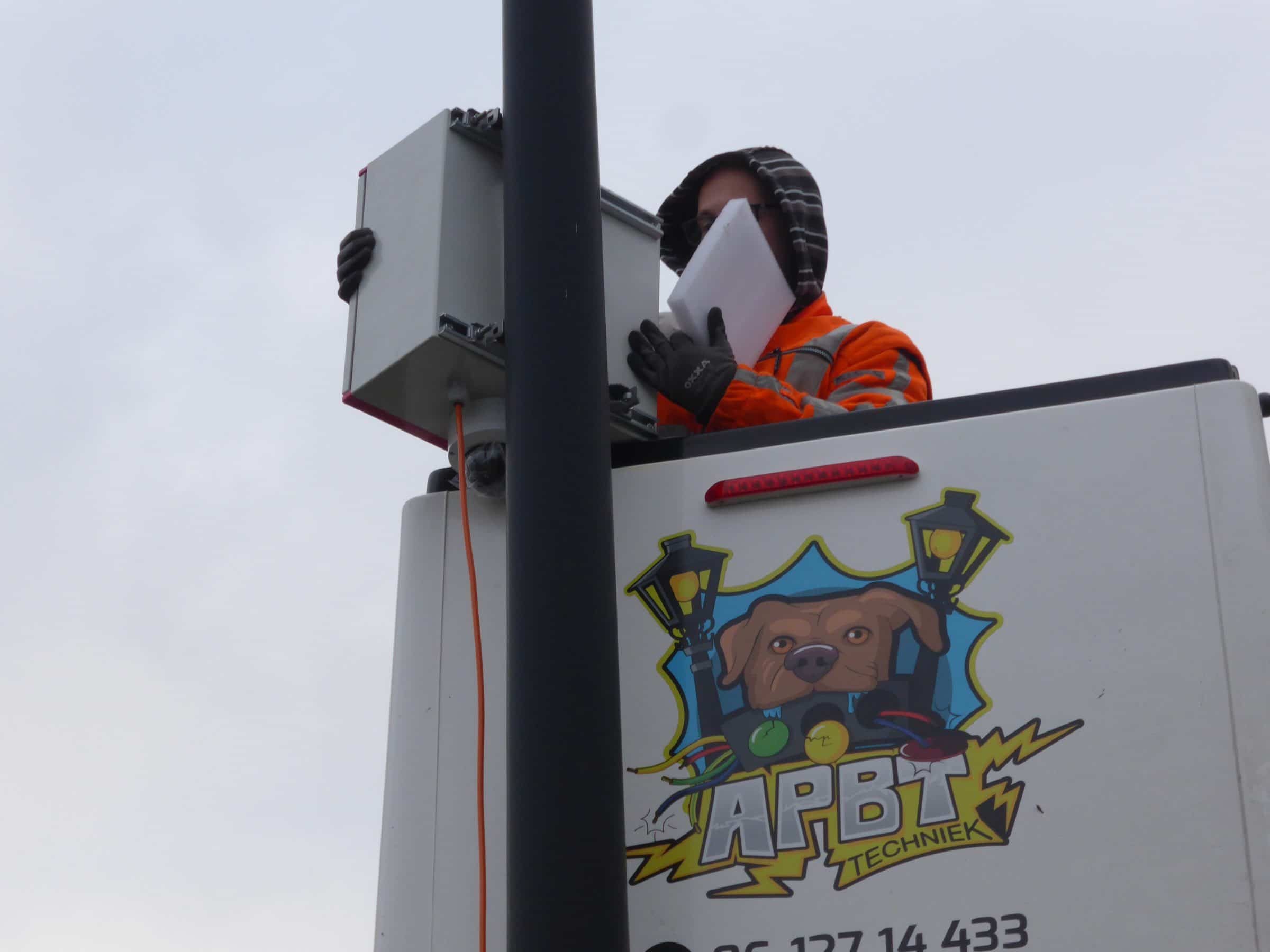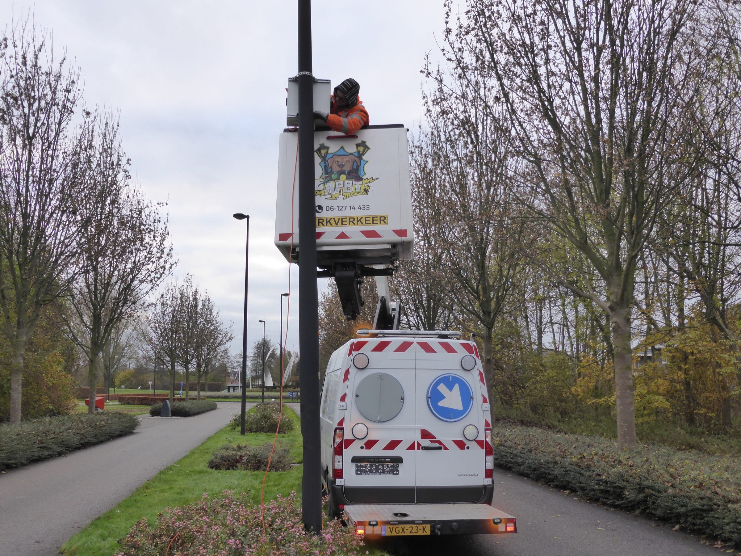 Zowel van het ingaande als het uitgaande verkeer worden nu camera beelden gemaakt en er komt ook een (verplicht) bord met de melding dat er opnamen worden gemaakt. Dat bord komt met een paar dagen, maar vanochtend werd de camera geïnstalleerd. Een flinke klus want in de behuizing zitten ook batterijen die gevoed worden uit de lantaarn waar hij aanhangt, maar een handige monteur deed dat in zijn eentje, een beetje balanceren met die behuizing op zijn bakje waarin het zaakje omhoog werd gehesen. En nu maar afwachten of het helpt om de Golf Residentie nóg veiliger te maken.