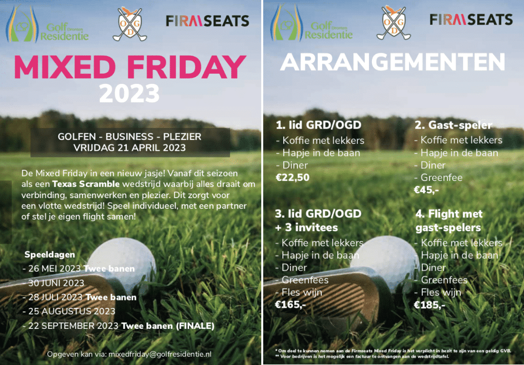 Erwin Hammer van Firmseats en diens zakenpartner Barend Jan Kroese zijn met de golfclub van de Golfresidentie een driejarig sponsorcontract overeengekomen waarin ook is vastgelegd om de naam van het bedrijf te koppelen aan die van Mixed Friday. Firmseats is een moderne onderneming dat medische krukken en bureaustoelen maakt en klanten heeft in binnen- en buitenland.