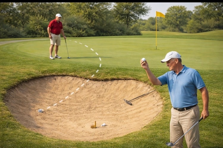 Wim en Ruud spelen hun rondje verder en zijn aangekomen op hole 5. Ruud slaat zijn bal in twee slagen op de green. Hij put een beetje te hard en de bal rolt over de green in de bunker. Dan verklaart Ruud zijn bal onspeelbaar en plaatst een bal op de plaats van de vorige bal en vervolgens put hij uit.