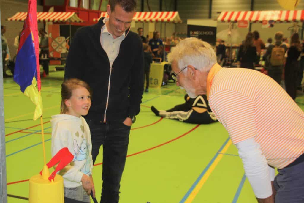 De Golfresidentie heeft zaterdag dankbaar gebruik gemaakt van de mogelijkheid om zich als golfclub te presenteren op de jaarlijkse sportmarkt in sporthal Het Dok aan de Educalaan. Enkele tientallen sportclubs gaven daar shows of uitvoeringen om vooral de jeugd kennis te laten maken met de vele verenigingen die Dronten heeft. De voorzitter van onze golfclub, George Gerritsen, ontving in zijn stand tientallen kinderen die op zoek waren naar meer informatie over de golfsport. “Ik denk”, vertelde hij niet ontevreden, “dat we toch zeker zo’n vijftien jongelui zo enthousiast hebben kunnen maken dat zij binnenkort op een vrijdagavond verder komen snuffelen op de drivingrange of andere oefenfaciliteit”.