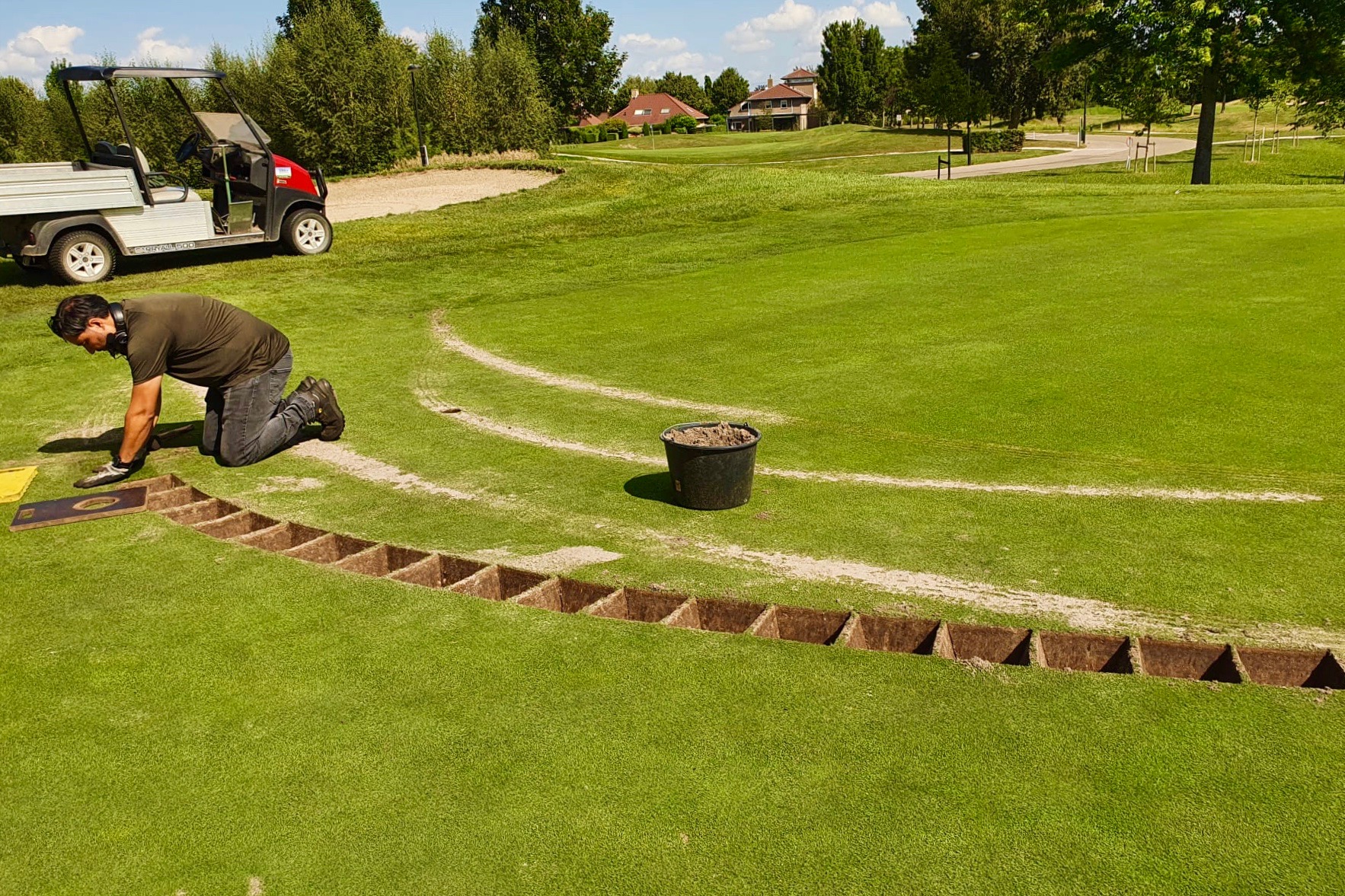Vanmorgen zijn de greenkeepers begonnen met het herstel van de green van hole 17. Die werd gisternacht zwaar beschadigd nadat een onverlaat er met zijn auto over heen was gereden. Vanwege het clubkampioenschap Strokeplay dat dit weekeinde werd gespeeld werd de green zondag nog provisorisch hersteld; nu is begonnen met een definitieve aanpak. Daarvoor wordt gebruik gemaakt van graszoden die permanent in de buurt van de puttinggreen voorhanden zijn. De verontwaardiging onder parkbewoners en golfers is overigens groot. Niemand begrijpt waarom dit is gebeurd. Intussen is aangifte van ernstige vernieling gedaan bij de politie. (foto Peter Beerlage)