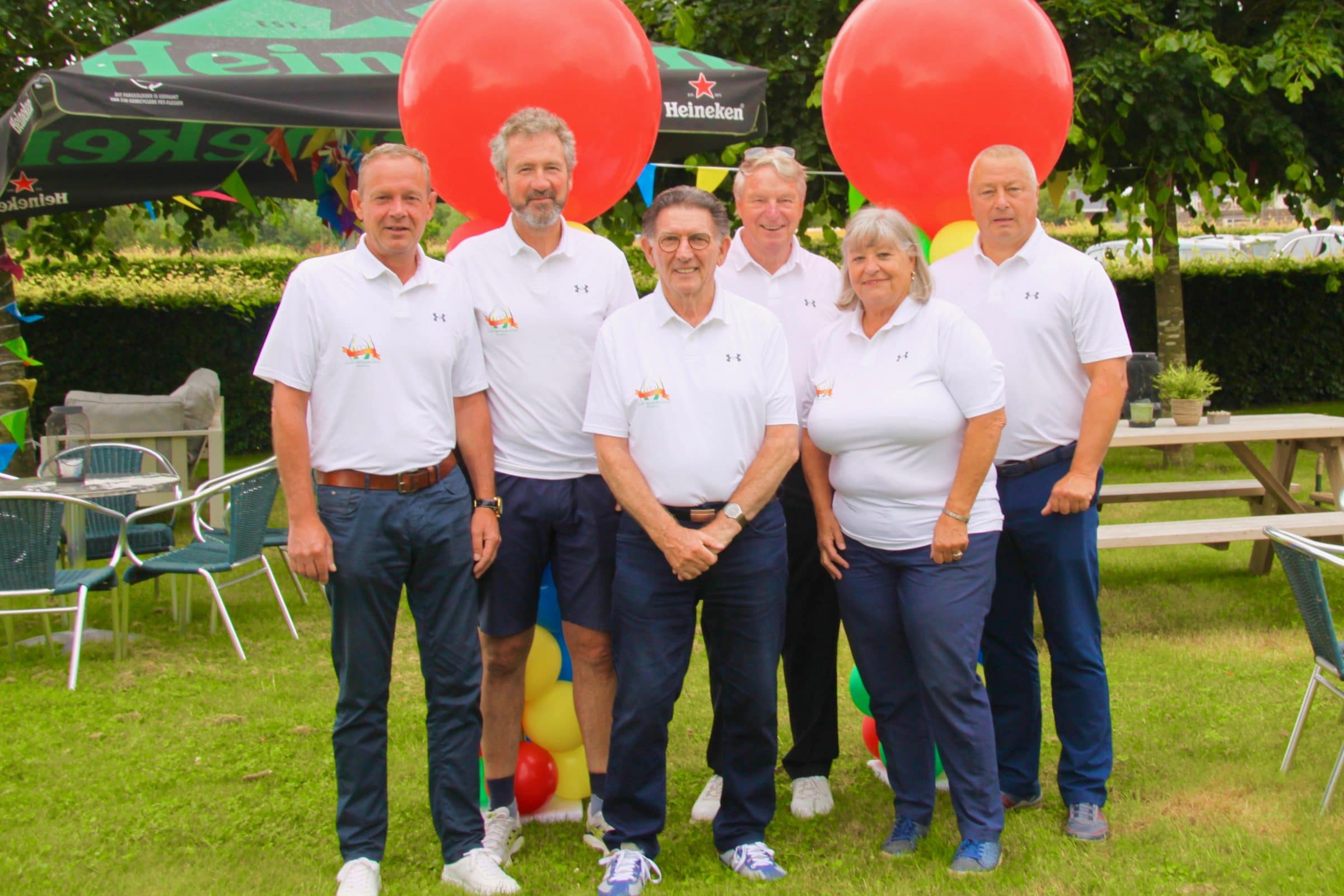 Het feest kan beginnen. De lustrumcommissie is er klaar voor. Na maanden van voorbereiding is vandaag de officiële start van de viering van het 25-jarig bestaan van de golfclub. Met ballonnen, vlaggetjes en tenten zijn terras en tuin van het clubhuis veranderd in een kleurrijke entourage. Daar worden om drie uur vanmiddag de gasten ontvangen en het officiële startsein van het lustrum gegeven. De commissie heeft leden en bewoners uitgenodigd daarbij aanwezig te zijn. Vanmorgen is een tweestokkenwedstrijd begonnen en morgen is de befaamde 25-holeswedstrijd. Ook op alle andere dagen van de week zijn er wedstrijden die zaterdag culmineren in een carnavaleske cross country gevolgd door de prijsuitreiking en een gezellig muzikaal feest. Vandaag draait voor het eerst ook het befaamde Rad van Fortuin waarmee geld wordt ingezameld voor het goede doel: het Ontmoetingspark Buiten in het centrum van Dronten. De vijfde lustrumcommissie bestaat uit, van links naar rechts, Jan de Vries, Chris van den Brand, Arthur Vos, Hans de Jongh, Marijke Prins en Vincent Uhlenbeck. (foto Mireille van der Velden)