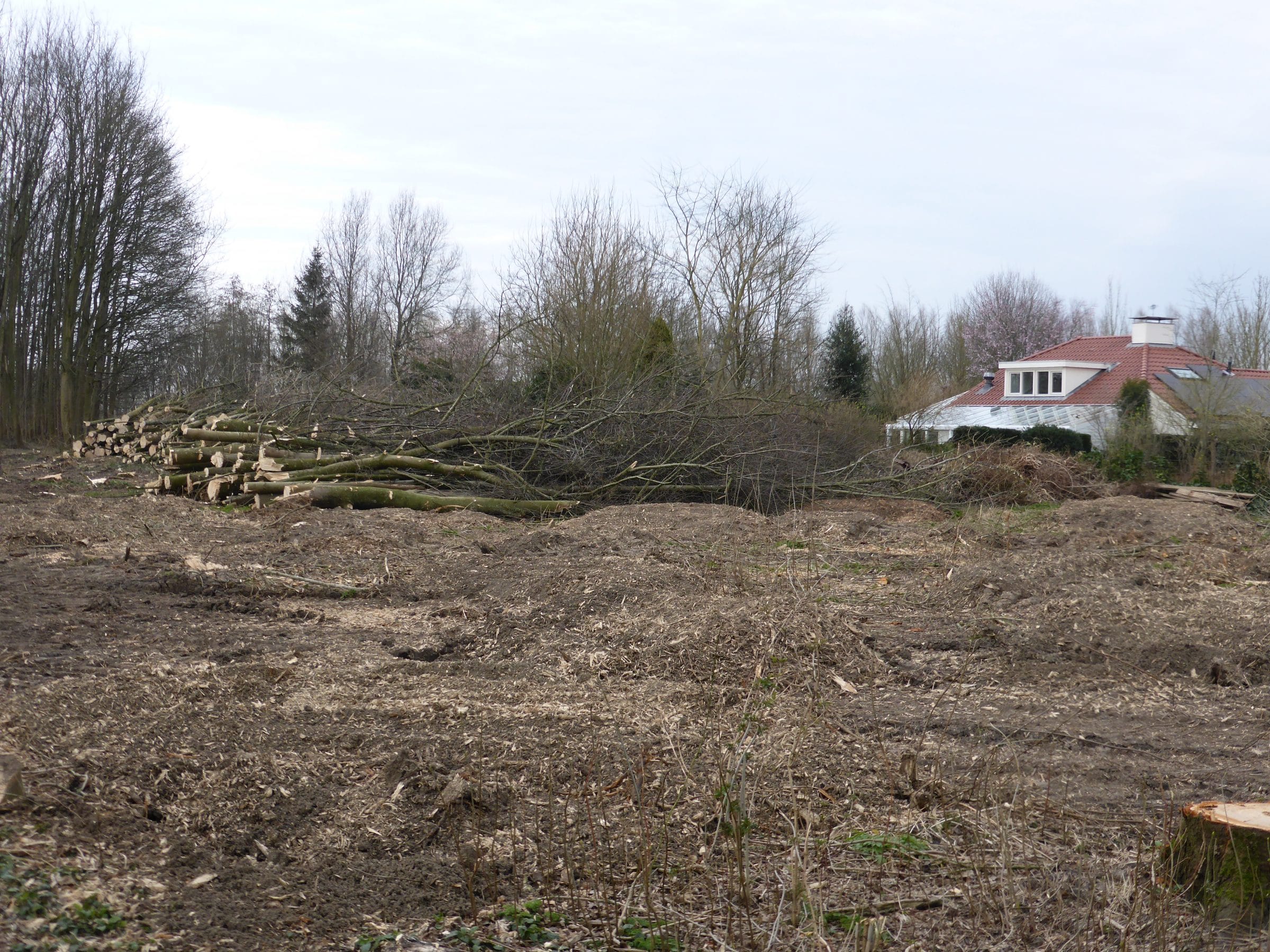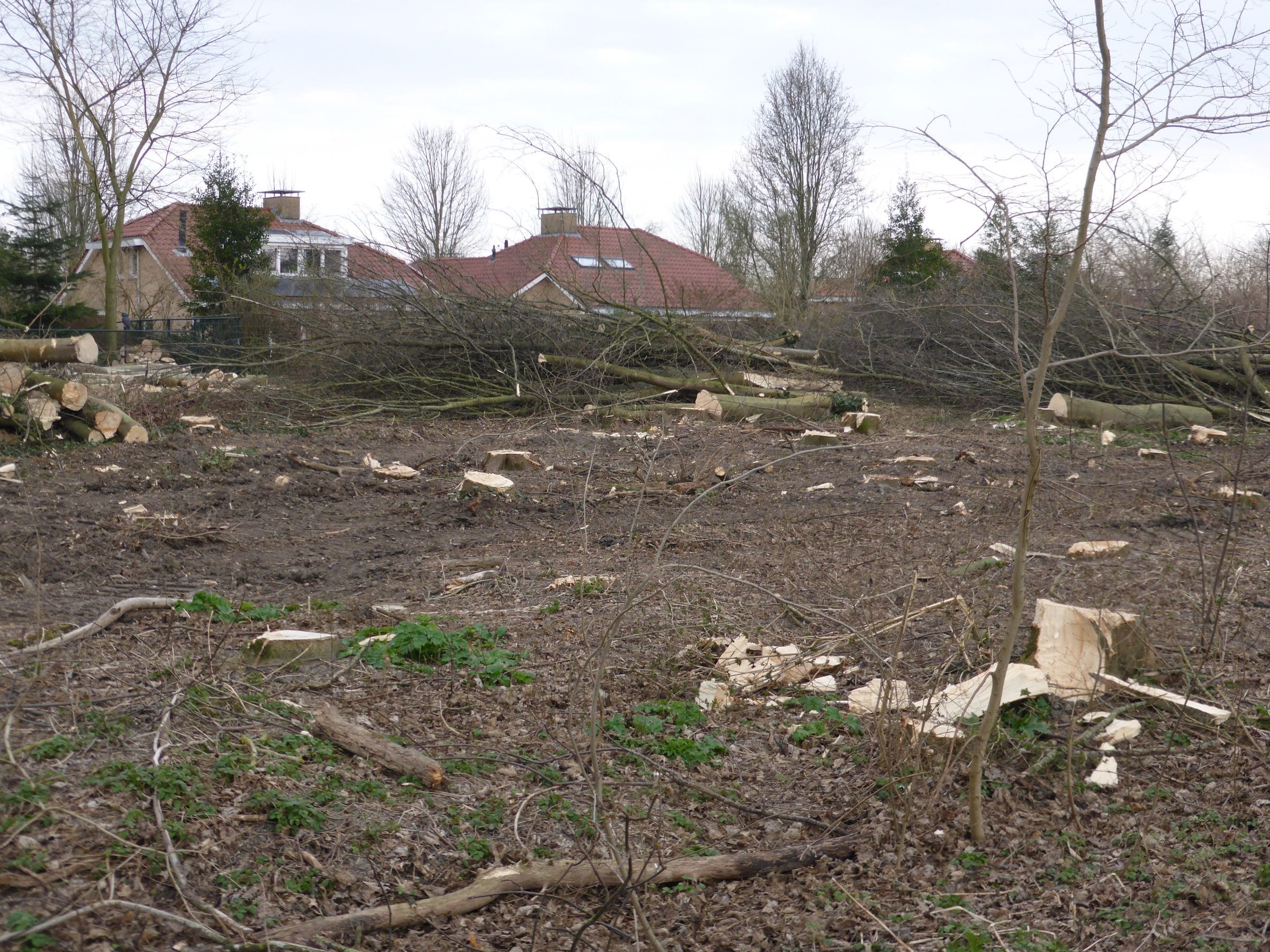 De gekapte bomen waren grotendeels zieke essen en ook vanwege de hoogte en de dreiging om bij omvallen tuinen en evt. huizen te beschadigen is door de eigenaar ervoor gekozen de gehele strook te verwijderen. (Zie foto’s) Ook de alpaca’s hebben een kleinere ruimte gekregen.