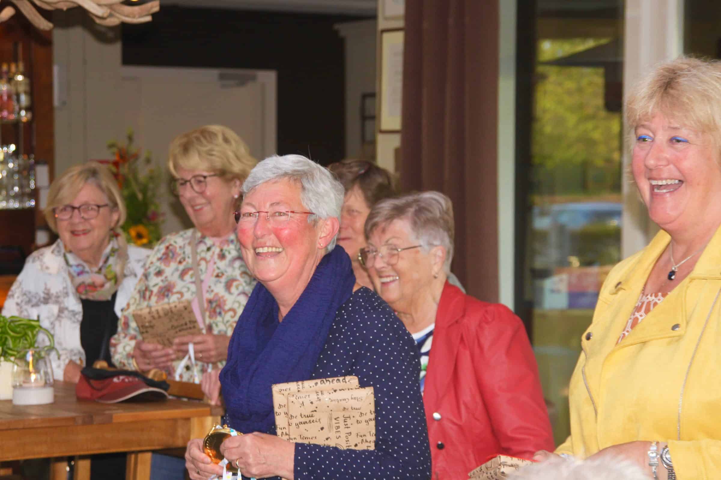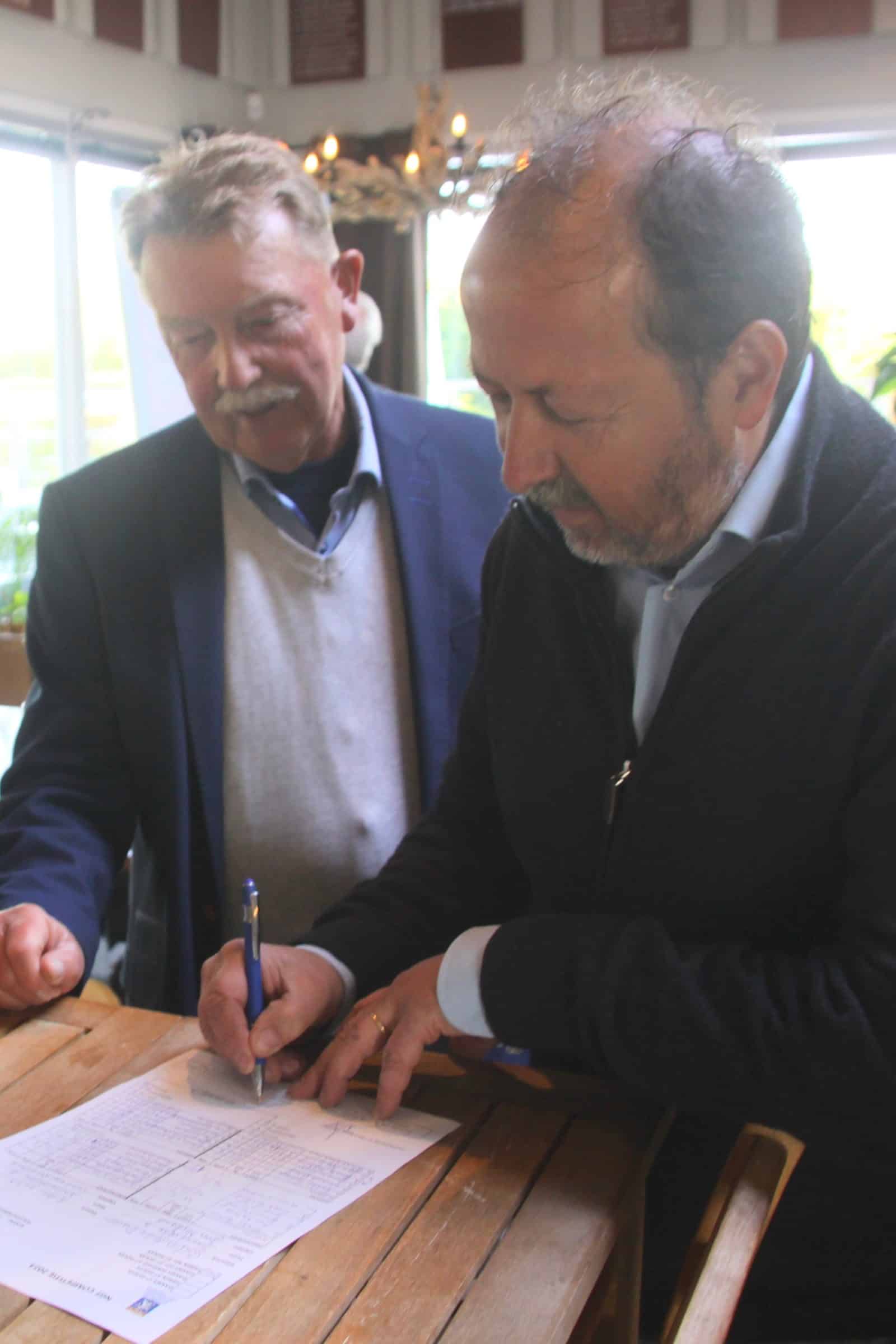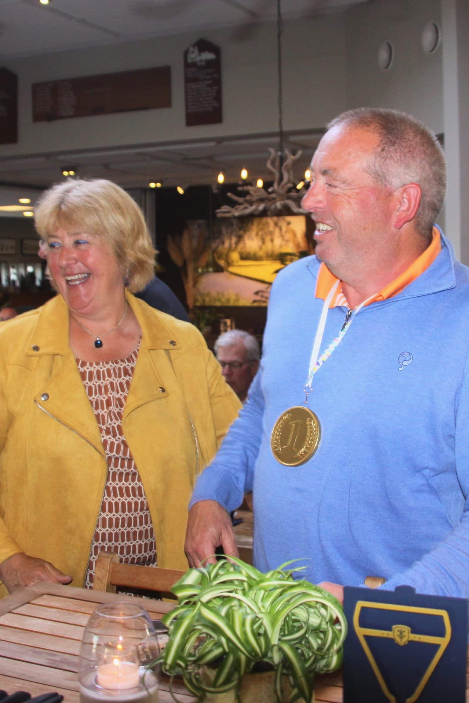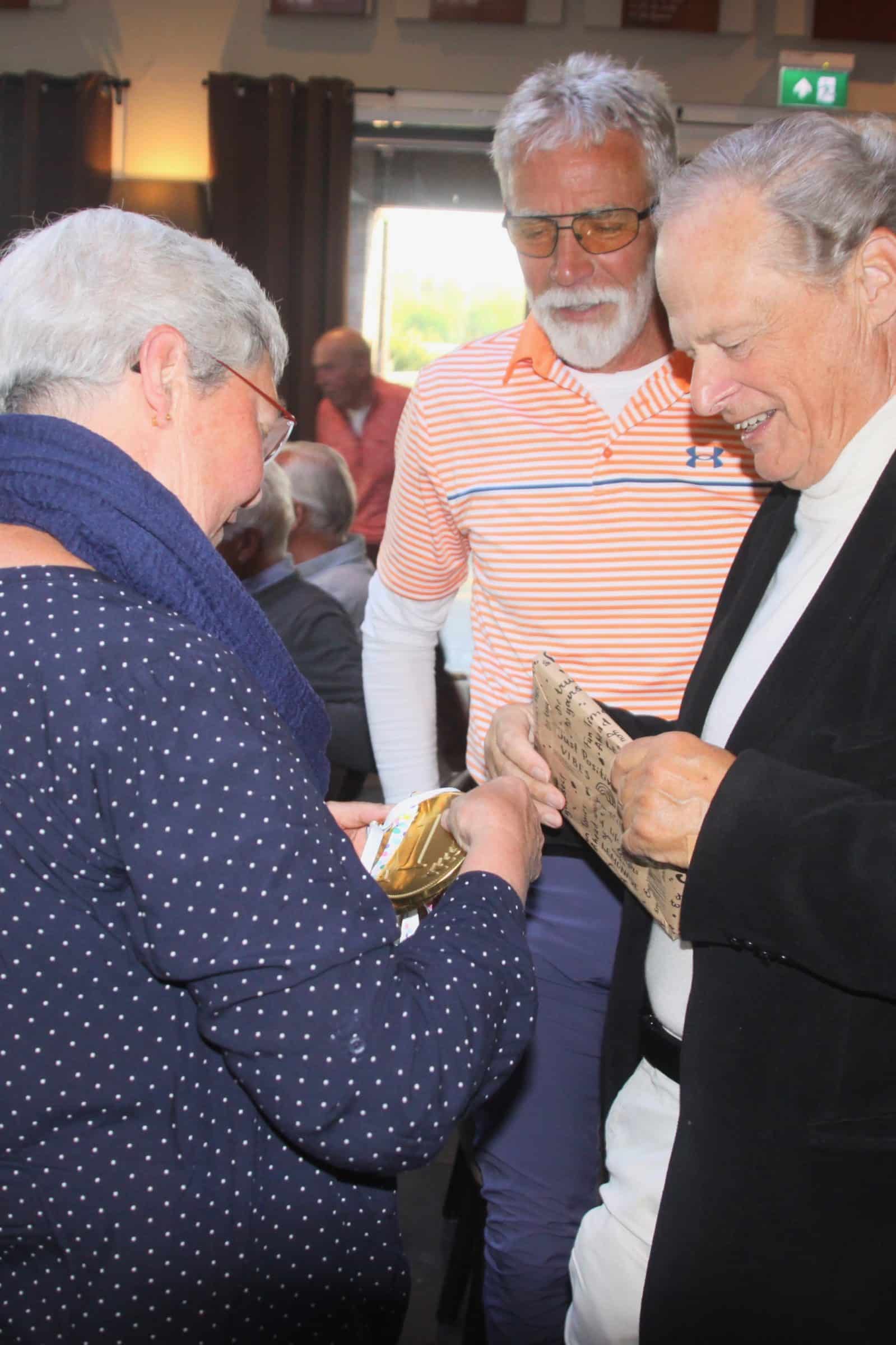 Bij de foto’s: Maar al te graag vult George Gerritsen de uitslagenlijst in en glundert teamcaptain Feike Greidanus van oor tot oor. Piet van der Sar krijgt een cadeautje en de medaille uitgereikt, twee captains zetten hun handtekening onder de NGF-papieren, Marco Oussoren en zijn echtgenote genieten zichtbaar van de vrolijke stemming en ook de dames hebben het grootste plezier bij de huldiging van hun mannen.