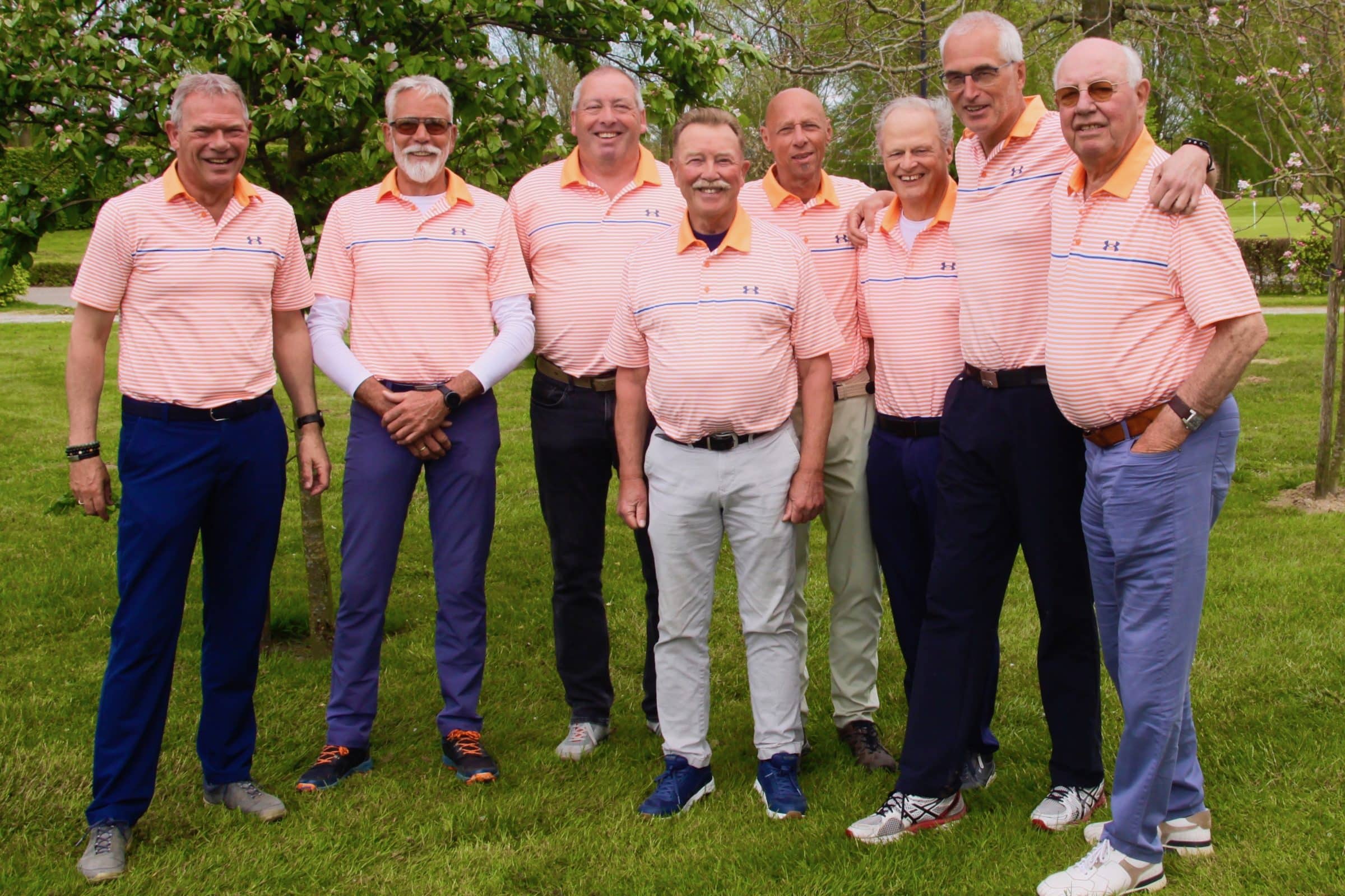 Het Drontense kampioensteam in een nieuwe smaakvolle outfit met op de voorgrond captain Feike Greidanus en verder van links naar rechts Kees Westland, George Gerritsen, Marco Oussoren, Jelle van der Veen, Piet van der Sar, Rob van Dijk en Harbert Knottnerus.