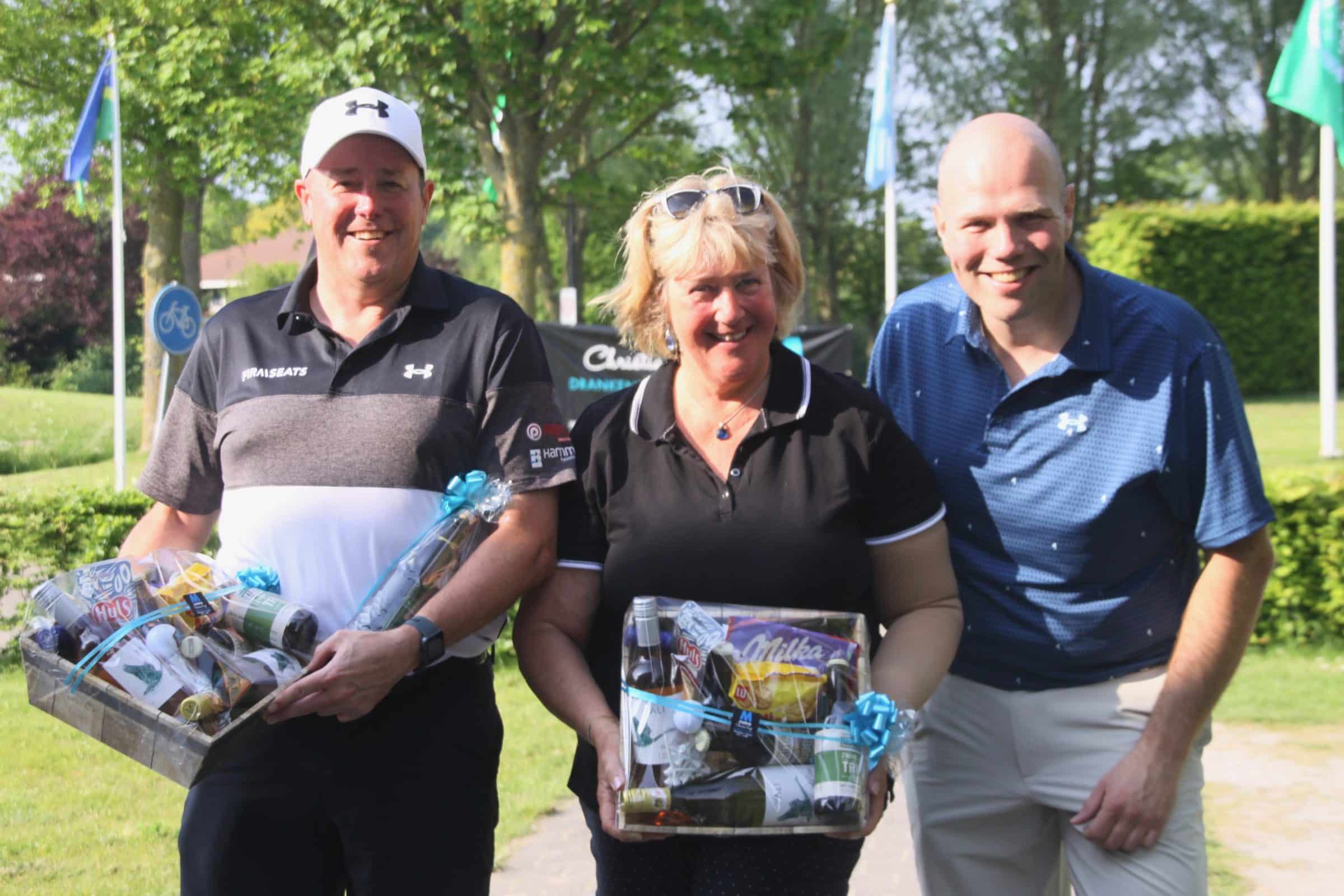 Golfer en Golfster van de Maand, Ferry Sijtsma en Loes Oussoren met de sponsor van de Maandbeker, Christian Voogt.