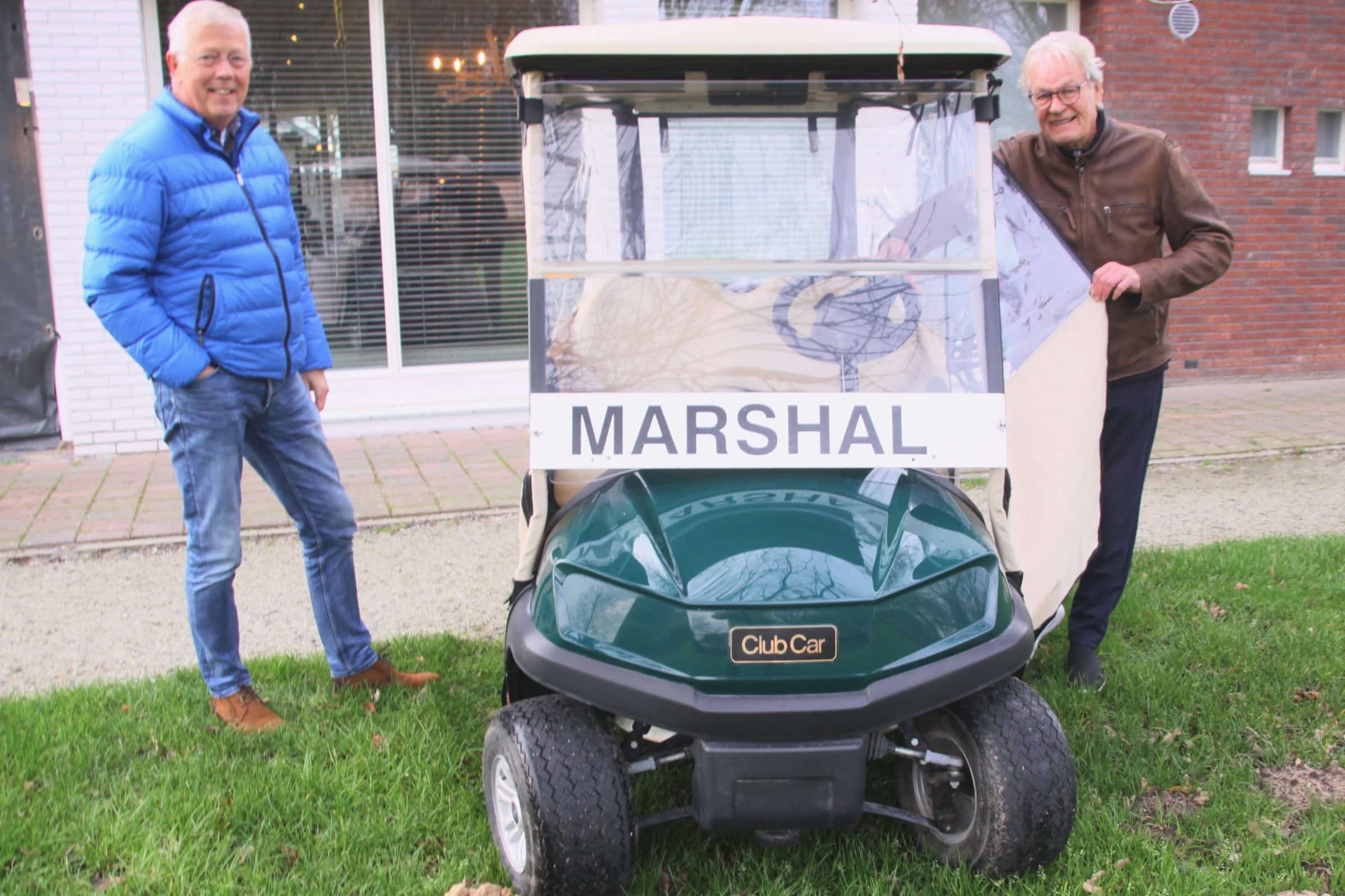 De marshalcar heeft een nieuwe, bijna chique behuizing gekregen waardoor de marshals het ook in het najaar en de winter droog en warm(er) houden als zij de baan in gaan. Arjen van der Meij heeft de aangeklede buggy vanmiddag in ontvangst genomen in bijzijn van de voorzitter van de wedstrijdcommissie Herman van Someren. Het was een langgekoesterde wens van Arjen om de marshals een betere behuizing te geven. De nieuwe opbouw is in Amerika op maat gemaakt – made in the USA – en voldoet aan alle eisen die de marshals eraan wilden stellen. Arjen is er in elk geval trots op; hij hoopt dat het meer leden van de golfclub zal motiveren om zich als marshal bij hem aan te melden. (foto Hans de Jongh)