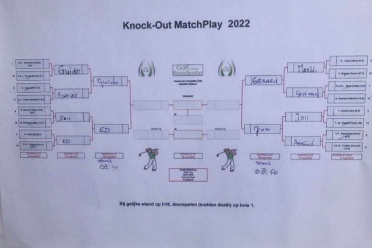 Guido Oomkens, Ed Visch, Gerard Bosman en Jon Douma spelen zondagmorgen de semi-finale om het clubkampioenschap Matchplay 2022 bij de heren. Twee van hen spelen ’s middags de finale. Tussen de beide wedstrijden in is de start van de supporterswedstrijd. Daaraan doen 19 spelers mee onder wie drie uitvallers van de knock-out wedstrijd van vanmiddag. Die wordt driebal Stableford gespeeld.