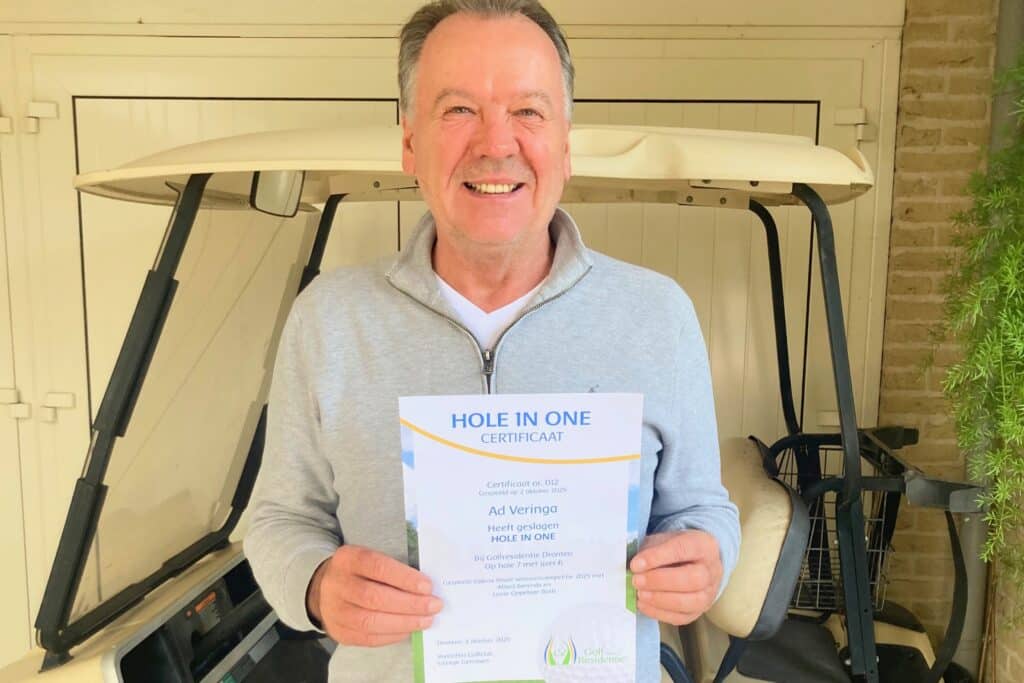 Uit handen van de voorzitter van de seniorencommissie heeft Ad Veringa een Hole in One Certificaat ontvangen voor zijn ace die hij op 2 oktober had geslagen tijdens de seniorencompetitie. Hij deed dat op hole 7 met een ijzer 6. Direct na afloop van de wedstrijd werd hij in het clubhuis al gefeliciteerd door de voorzitter van de wedstrijdcommissie, Herman van Someren, die hem bij die gelegenheid ook de Hole in One Trofee van de golfclub uitreikte. Omdat hij aan alle voorwaarden had voldaan trad Ad ook toe tot de exclusieve Bols-Hole-in-One-Club. Van destillateur Lucas Bols ontving hij het Membership Award en een badge voor aan de golftas evenals een gepersonaliseerd goudkleurig plaatje. Een lidmaatschap van de Bols Hole-in-One Club is voor het leven. De Bols Club telt zo’n 30.000 leden van Ameland tot Zanzibar en van Aruba tot Zeist. Voor Ad was zijn lidmaatschap aanleiding om via zijn Facebook-account te laten weten dat hij lid was geworden van de mooiste club die er bestaat….