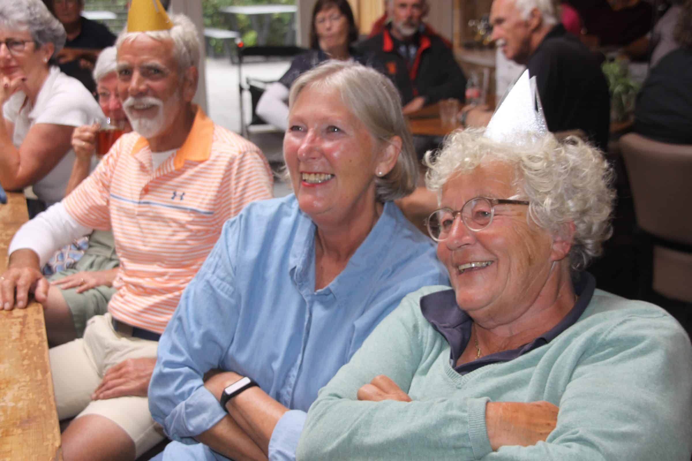 Er scheen – zij het niet lang – toch een oranjezonnetje tijdens Prinsjesdag hoewel ook de wind nadrukkelijker dan anders op deze vorstelijke dag van zich liet horen. De organiserende damescommissie was desondanks zeer tevreden met het verloop van de wedstrijd waarvoor de 22 deelnemende prinsessen een eigen prins mochten uitkiezen om aan de Greensome wedstrijd mee te doen. Jacqueline Booy en Han van Dijk werden aan het eind van een prinsheerlijke dag in het clubhuis gekroond tot koningskinderen; zij immers hadden met hun gemeenschappelijke playinghandicap laten zien dat ze over de beste papieren beschikten en de wedstrijd met 42 Stablefordpunten hadden gewonnen. Voor Sigrid de Vries en Peter Blom betekende het dat zij hun hoogwaardige status die ze het afgelopen jaar voerden vaarwel moesten zeggen. Zij eindigden dit keer als tweede met 35 punten. Thea Hussaarts en Stanley van der Velde werden met één punt minder derde. Op de foto linksonder drie flights die zich bij hole 3 hadden laten fêteren op een drankje en een zelfgebakken stuk appeltaart en op de foto rechts kijken van links naar rechts George Gerritsen, Mary Ann Berns en Do Veltman toe hoe de winnaars sjerp en kroon krijgen als teken van hun nieuw verworven waardigheid. (HdJ)
