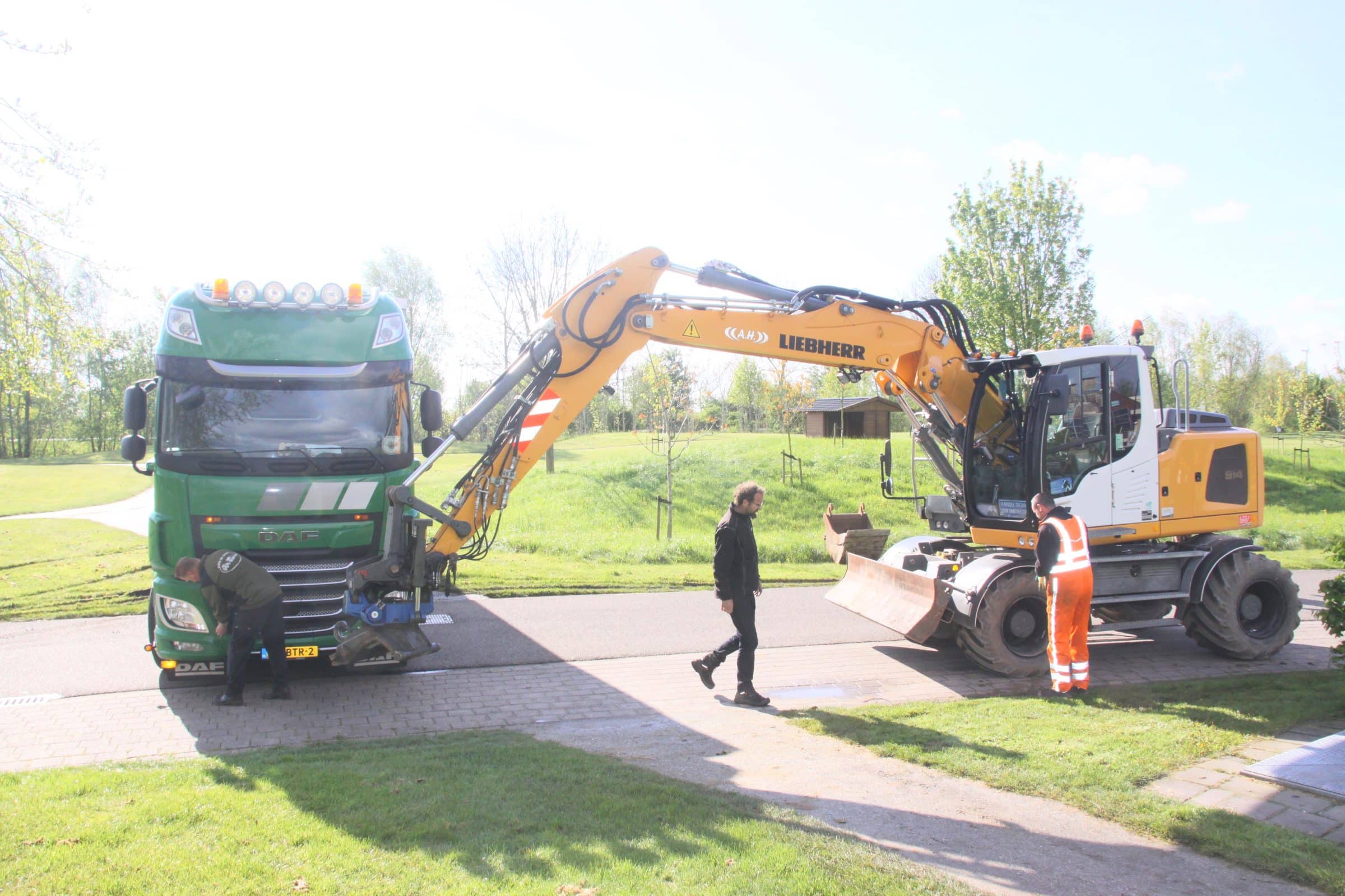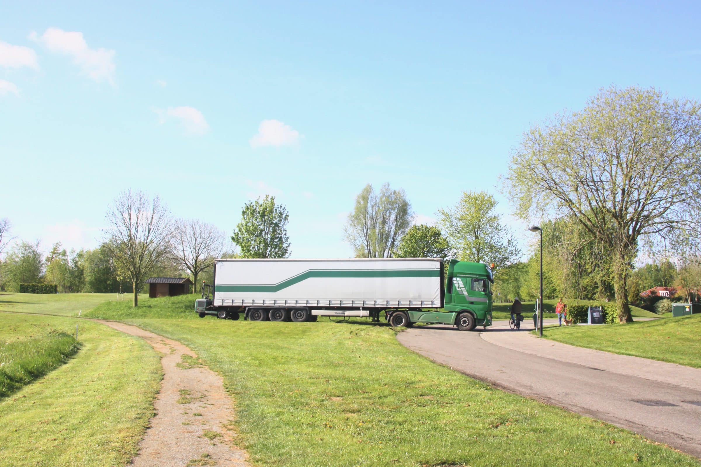 Een vrachtwagen van loonbedrijf Kees de Gier heeft vrijdagmorgen enige tijd de toegang tot hole 3 geblokkeerd nadat de chauffeur bij een poging om daar te keren met zijn truck kwam vast te zitten in de drassige bodem van het pad. Het lukte de man niet om op eigen kracht weg te komen. Met behulp van een mobiele graafkraan, die aan het werk was bij de Eindhovenselaan op de Parkresidentie lukte dat uiteindelijk wel waarna de diepe sporen op het toegangspad duidelijk zichtbaar werden. Passanten verbaasden zich erover dat de chauffeur zich kennelijk niets heeft aangetrokken van het verbodsbord bij de toegang tot het park. Duidelijk is wel dat het bedrijf een gepeperde nota tegemoet kan zien. (HdJ)