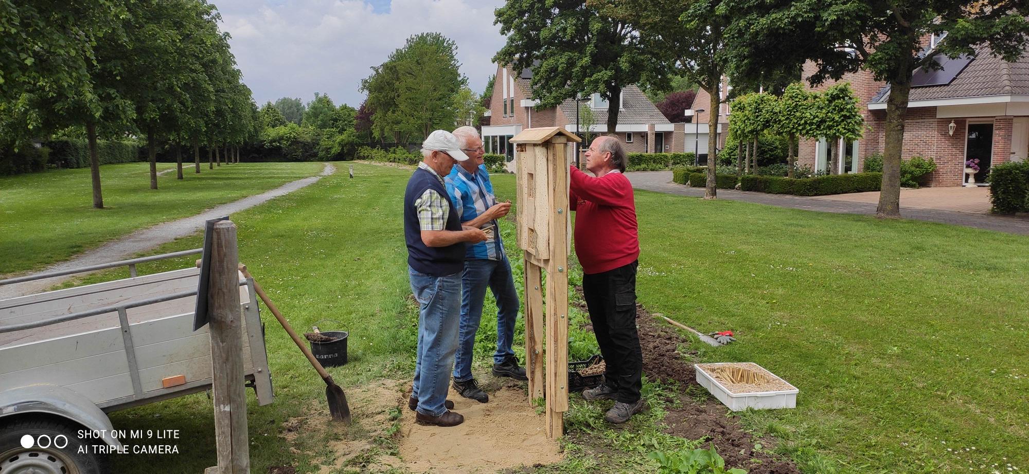 Vrijwilligers bouwen hotels, ook aan insecten wordt gedacht.