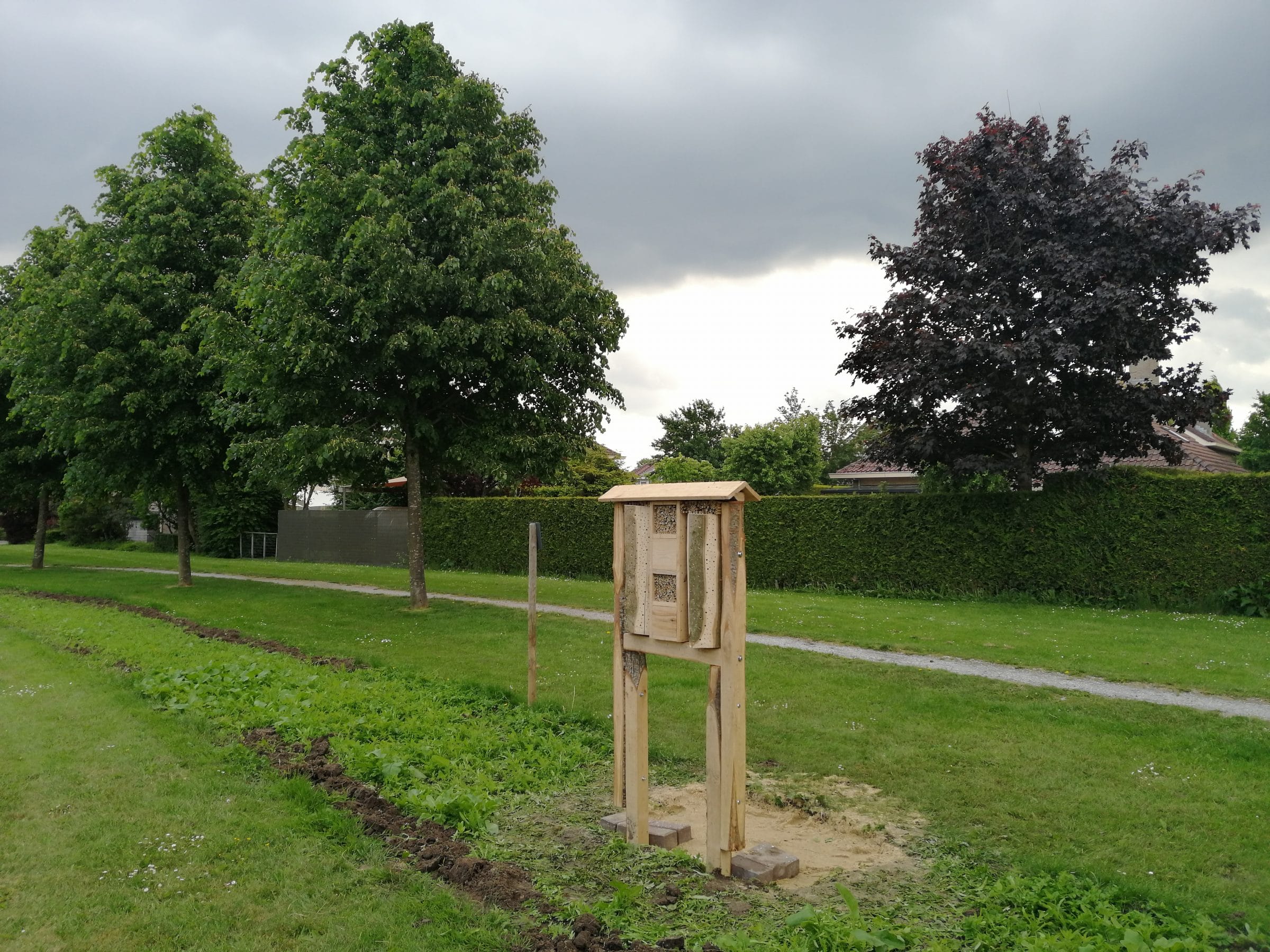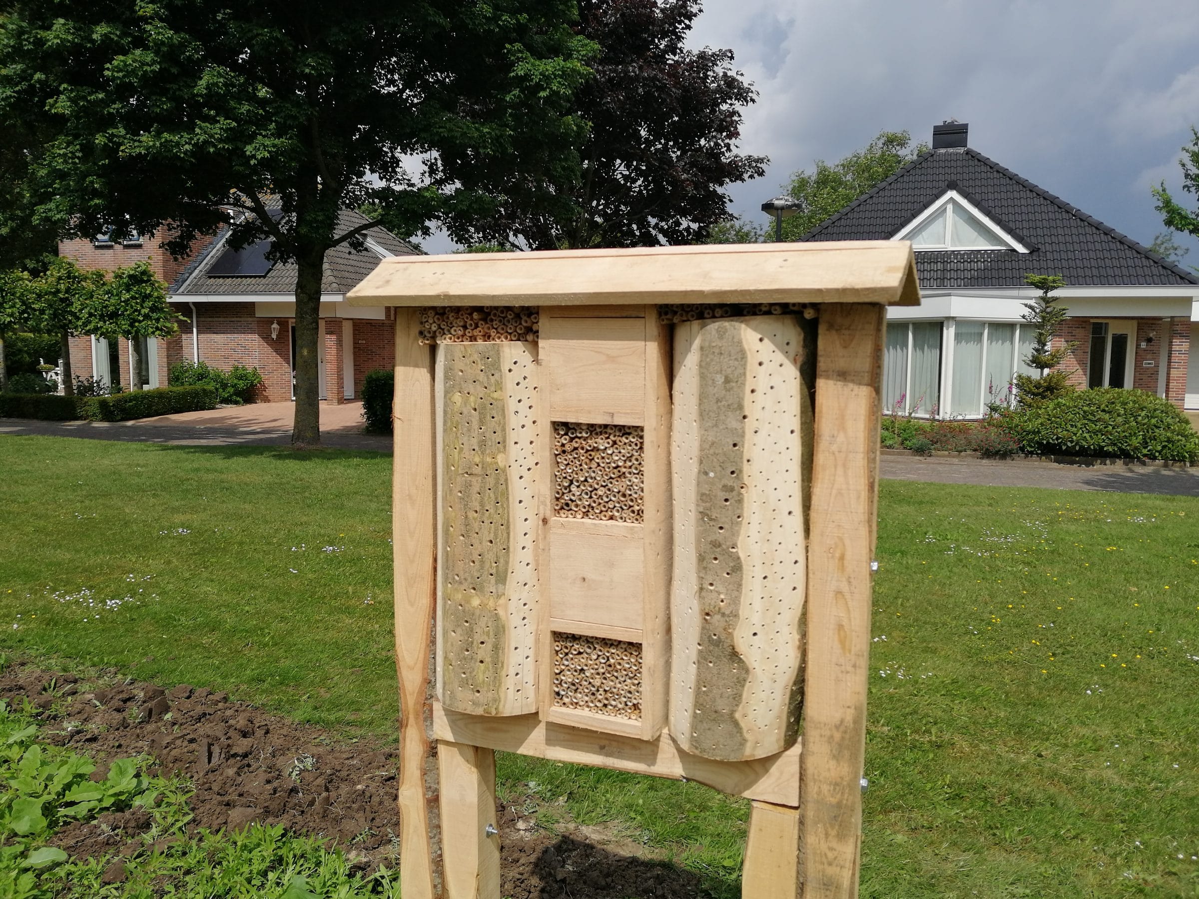 De vrijwilligers van de Klusgroep en Natuur&Milieu hebben een insectenhotel van formaat geplaatst bij de bloemen op de Diagonaal, een logische combinatie. Een tweede hotel volgt later alsmede de verdere afwerking. Er wordt veel aan het milieu en de natuur gedaan op de Golf Residentie en dit is daar weer een mooi voorbeeld van.